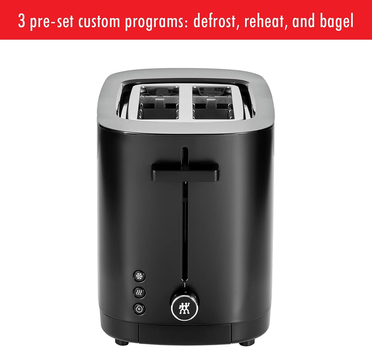 The 2-slot ZWILLING black toaster ensures evenly browned toast, bagels, muffins, and more, every time you use it. The 2 slice toaster has many amazing functions. This model features eight separate heating elements and balanced heat distribution ensure that every slice of bread is evenly toasted on both sides, even after repeated toasting. The result: toast that’s crispy on the outside and soft on the inside. And when it's finished, toast doesn't fly out of the toaster. The soft-lift feature ensures it gently glides up and the built-in extra-lift allows even smaller slices to be removed safely. Clean up is a cinch. Crumbs end up in the crumb drawer that slides out for easy removal. Like all Enfinigy products, this toaster offers a free downloadable app. The ZWILLING Culinary World App QR code on the product packaging fires up the app so you can search a database of original recipes.