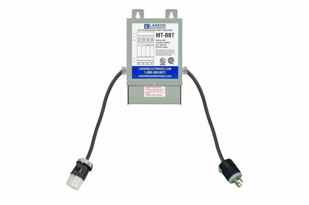 The MT-BBT-208V-236V-10.94A-2X2FT-6.15 Single Phase Step-Up Prewired Buck and Boost Transformer from Larson Electronics is powerful, reliable,and designed with the environment in mind. Suitable for both indoor and outdoor applications, the MT-BBT-208V-236V-10.94A-2X2FT-6.15 provides increased reliability, higher efficiency, protection against critical equipment failures and an extra level of protection by isolating the power source from the connected device. The lower operating costs, lower heat emissions and lower cost of ownership make this transformer ideal for a wide range of applications and businesses. The MT-BBT-208V-236V-10.94A-2X2FT-6.15 is a prewired transformer for customer installation and is equipped with 2` of 8/3 SOOW cable on each side connected to the transformer with a 15 amp NEMA 6-15 straight blade plug on the primary side and a 15 amp NEMA 6-15 receptacle on the secondary side.