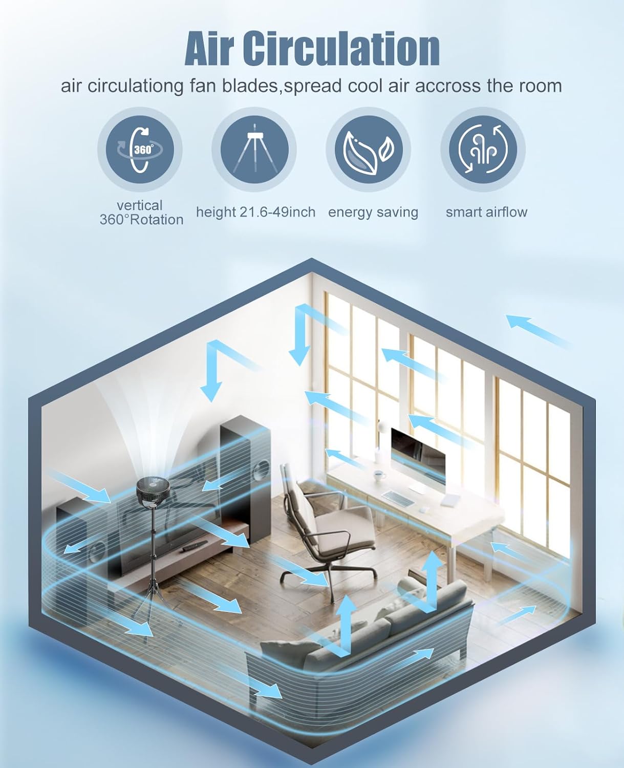 360° Rotation: Fan head pivots for widespread air circulation.