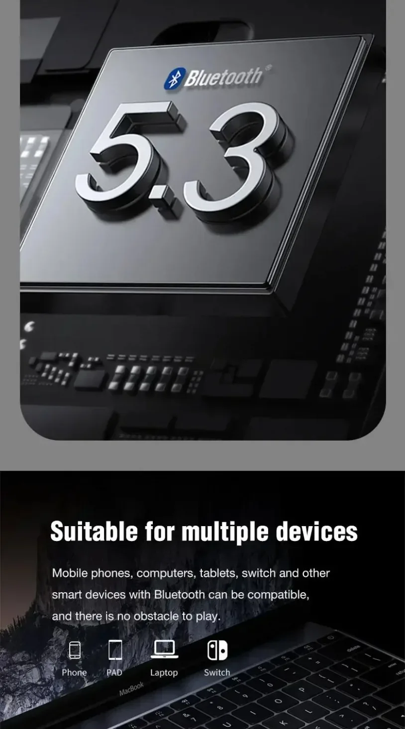 - Bluetooth 5.3: Stable, fast, and energy-efficient wireless connection.