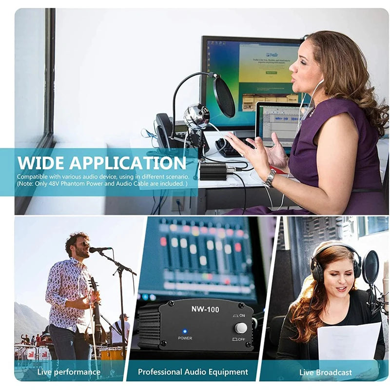 Designed in a compact, durable plastic housing, it includes an adapter plus an XLR microphone cable for immediate plug-and-play use. An LED power indicator and on/off switch offer easy operation for beginners and professionals alike.