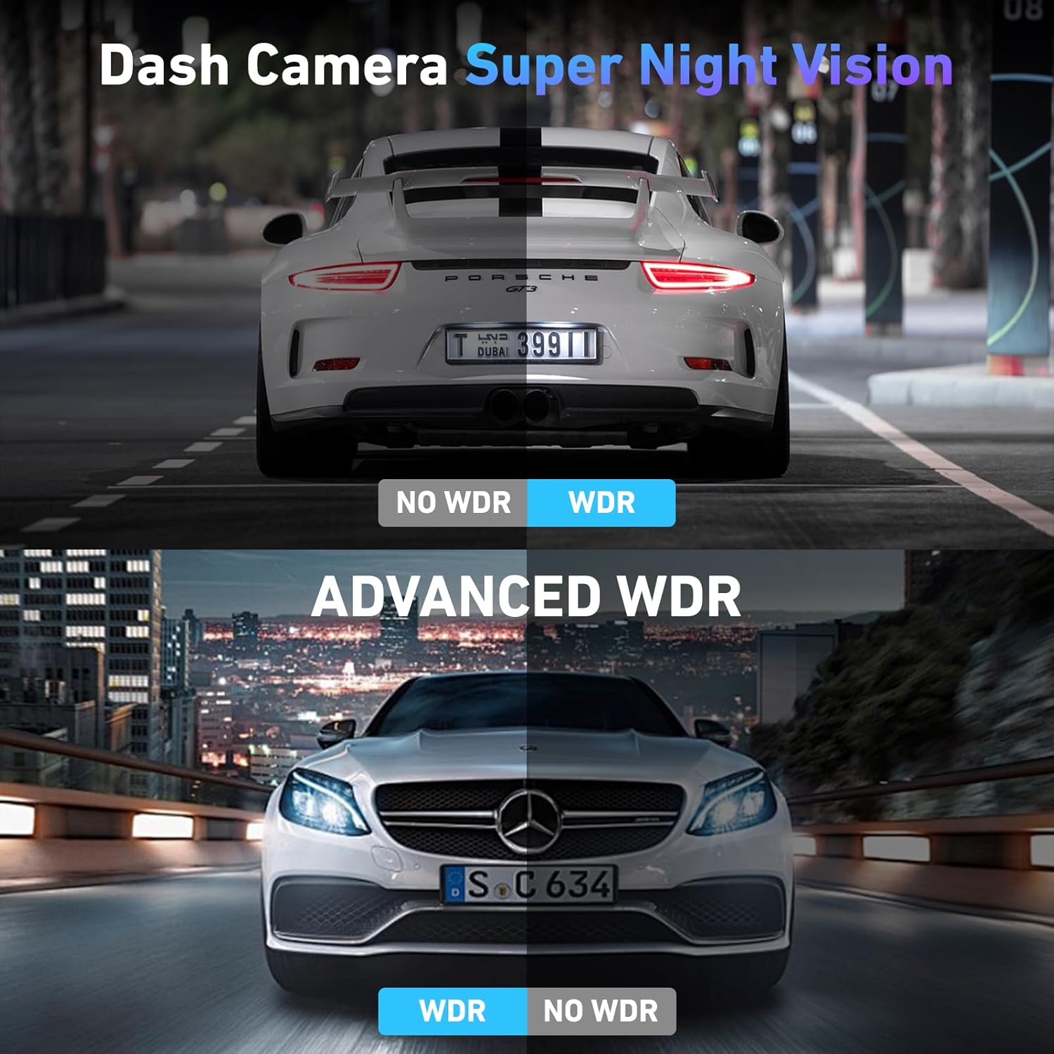 • NIGHT VISION DASH CAMERA: The car camera features a large F2.0 aperture with 4 IR LEDs making dashcam front and rear capture clear images in low light conditions or fast-moving scenarios, reducing blind spots;Superior dashcam HDR/WDR technology of the dash cam car camera creates a balanced image and shot by adjusting the exposure;4k dash cam is perfect for ensuring your safety by providing reliable video evidence even with night drives because of the 6 Glass Lens and for Sony IMX335 Image Sensor