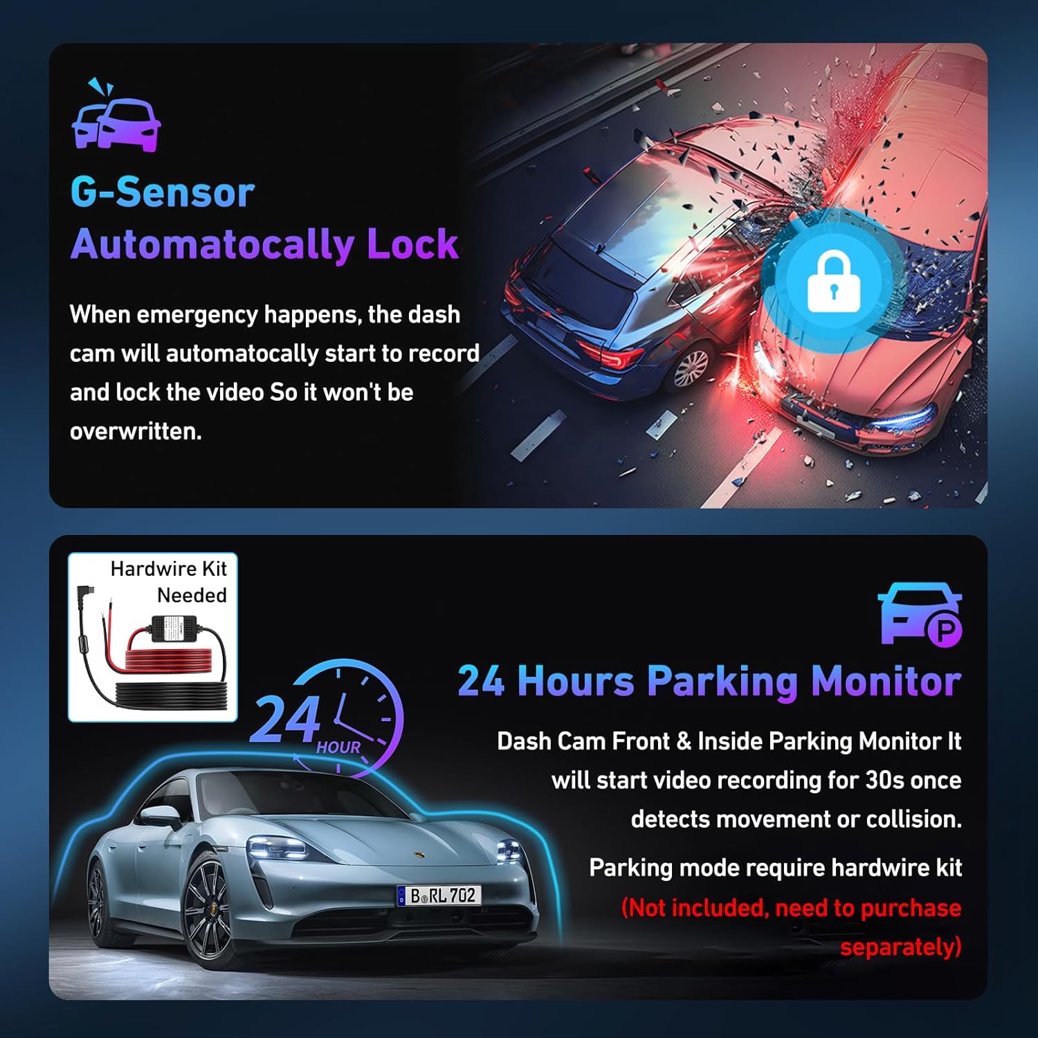 • DUAL DASH CAM with G-SENSOR & LOOP RECORDING:This wireless dash cam comes with a built-in G-sensor. It can detect sudden impacts, crashes, or bumps;Once such an event is detected, it will automatically lock the corresponding footage, preventing it from being overwritten and thus ensuring that important evidence is preserved;We suggest setting the G-sensor to the “low” level to avoid locking unnecessary footage. Moreover, this dash cam supports 4K seamless loop recording;When the 64GB memory card is full, it will automatically overwrite the oldest unprotected files, allowing for continuous recording without manual intervention