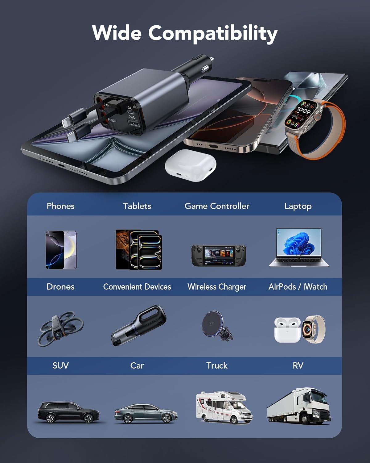 - Multi-device Compatible Car Charger: This 4-in-1 60W car charger is designed to meet the diverse charging needs of the modern traveller. Compatible with iPhone iPhone 16/16 Pro/16 Pro Max/16 Plus/15/15 Pro/15 Plus/15 Pro Max/14/14 Pro/14 Pro Max/14 Plus/13/13 Pro/13 Pro Max/13 Mini/12/12 Pro/12 Pro Max/12 Mini/11/11 Pro/11 Pro Max/XS/XS Max/XR/X, usb c charger for iPad Pro/Air/Mini,Apple Watch10,AirPods4, usb a charger compatible for Samsung Galaxy Ultra2/S24/S23/S22/S21/S20/S10/S9/S7/A12/A13/A22/A32/A52/A53/Note 20, LG, Google Pixel, Kindle, Wireless charger, Tablets, Switch, etc and more. This charger ensures that all your gadgets are powered efficiently and safely
