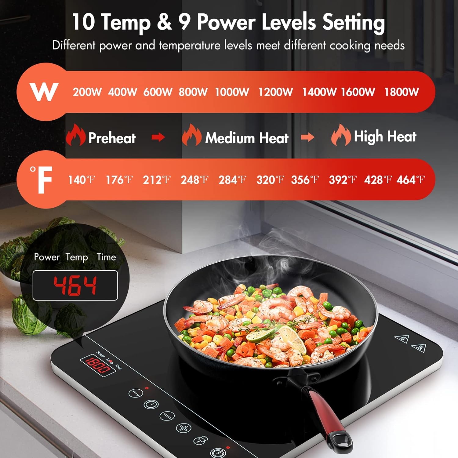 🥣【9 Power Levels & 10 Temperatures Variation】Aobosi single induction cooker with sensor touch control,through the light and sensitive touch screen you can set the temperature of the induction hob independent of 140 ℉o 464℉. You can also use a 3-hour digital timer.Besides,9 power levels from 200 watts to 1800 watts for your selection. Noted:When you cook the food or fried the food,you had better to use the temperature function.