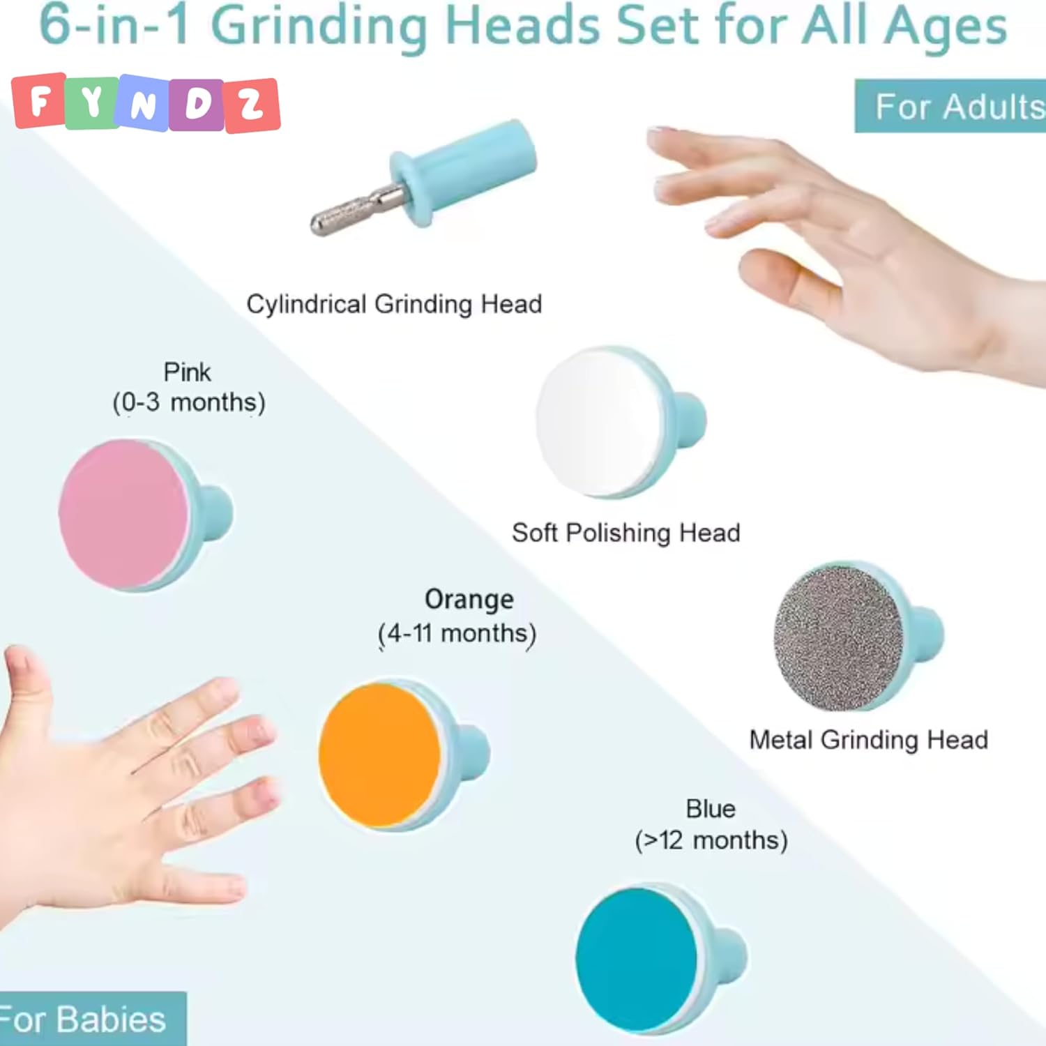 6 Versatile Grinding Heads – 4 cushioned sandpaper heads safe for babies and kids 2 attachments for adults, including 1 for callus removal Suitable for all ages