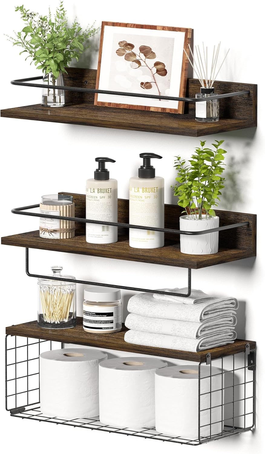 Bathroom Shelves with Wire Storage Basket, Wood Wall Mounted Floating Shelves Over Toilet Paper Holder with Towel Bar for Bedroom, Living Room, Kitchen and Bathroom
