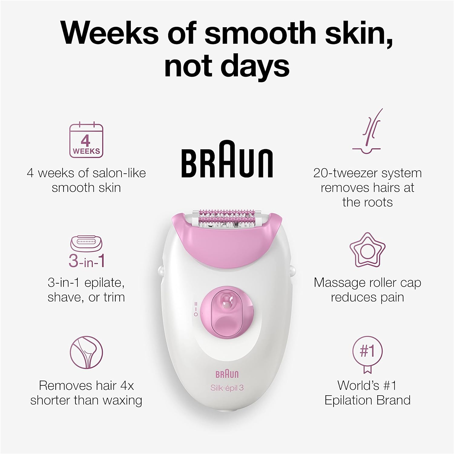 Braun Silk-épil 3 3-270, Epilator for Women for Long-Lasting Hair Removal, 20 Tweezer system, Smartlight Technology, Massage rollers, Shaver and Trimmer Head Included