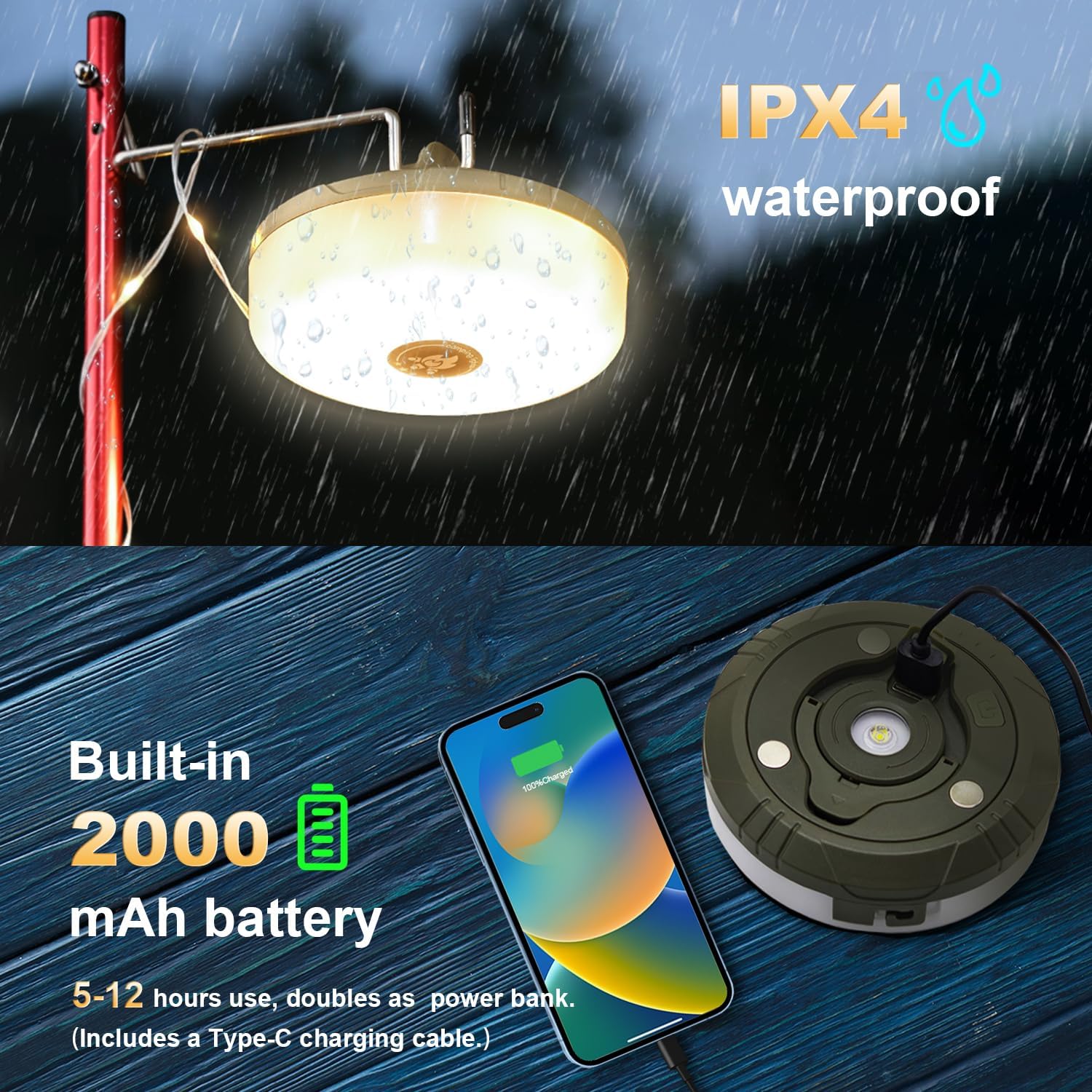 - Waterproof and Durable and 12 hours Runtime: Yoyotager camping string lights not only feature a built-in 2000 mAh rechargeable battery, providing 5 to 12 hours of operation depending on the mode but also serve as a power bank outdoors. A flashing blue power indicator keeps you informed about the charging status. With an IPX4 waterproof rating, these lights perform reliably even in wet conditions