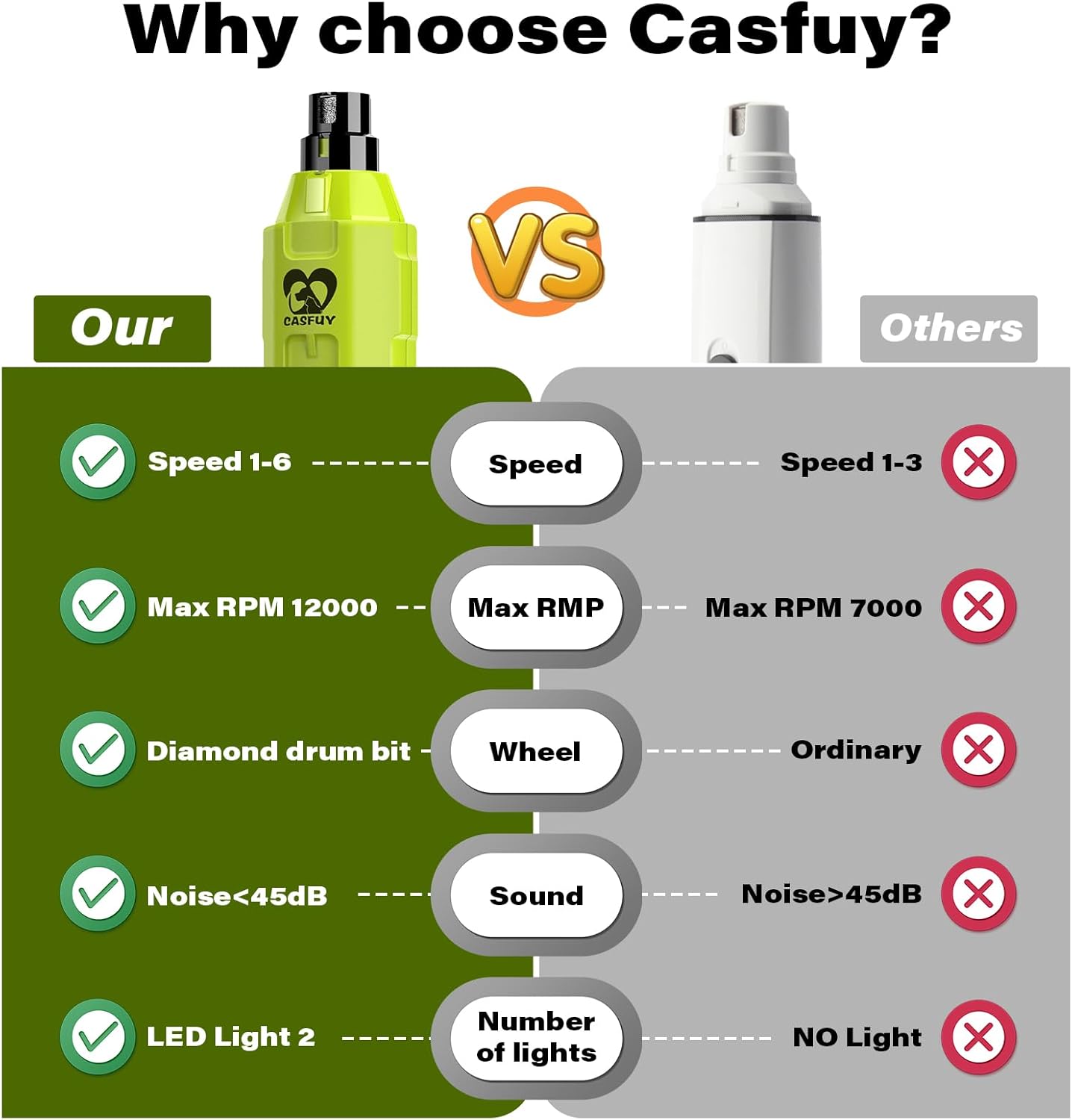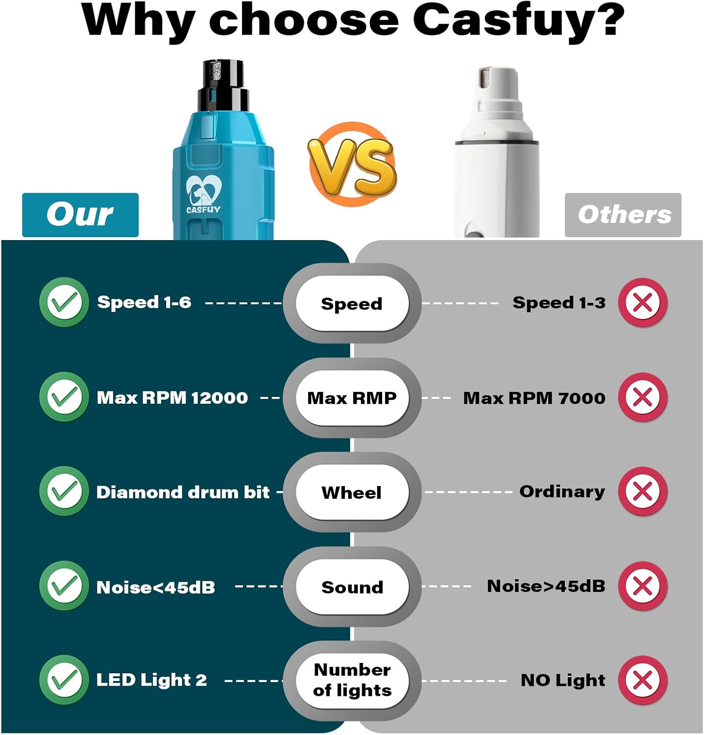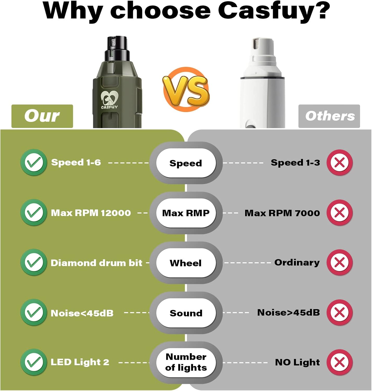 •  Newest enhanced power & 6 precisely controlled speeds: 7000RPM to 12000 RPM power makes Casfuy dog nail grinder one of the most powerful grinders on the market. It is also the safe power to grind at home. Multiple speeds and ample power meet small, medium, and large pets' nail trimming needs.