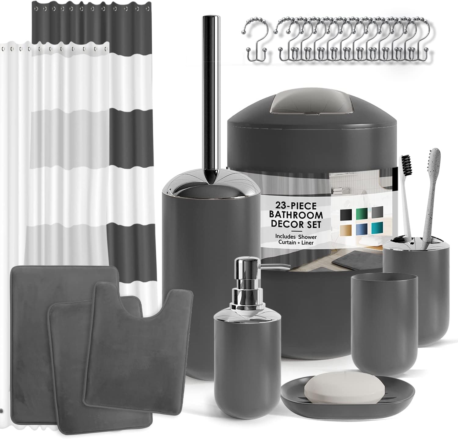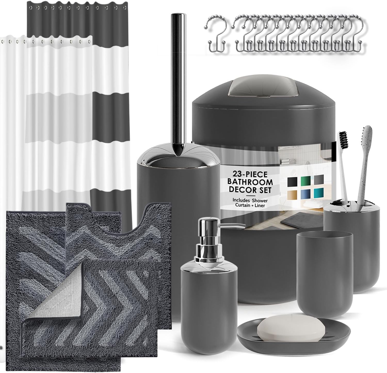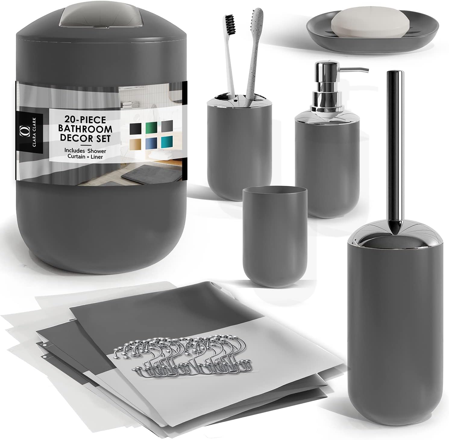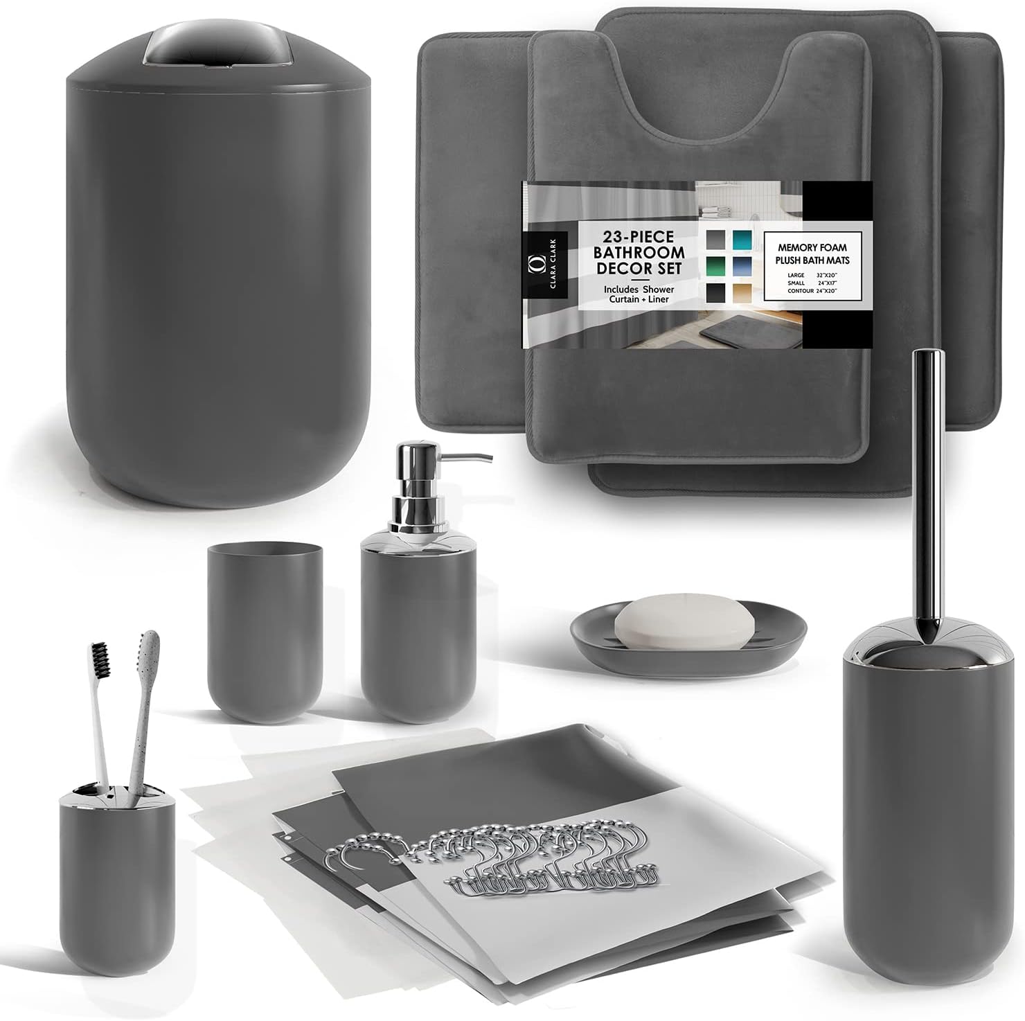 Clara Clark Bathroom Set - Gray Bathroom Accessories Set, Bathroom Sets with Shower Curtain and Rugs, 23PC Shower Curtain Set with Liner, Soap Dispenser, Soap Dish, Toilet Brush Holder, and Trash CanPL17-B09M16ZPL1