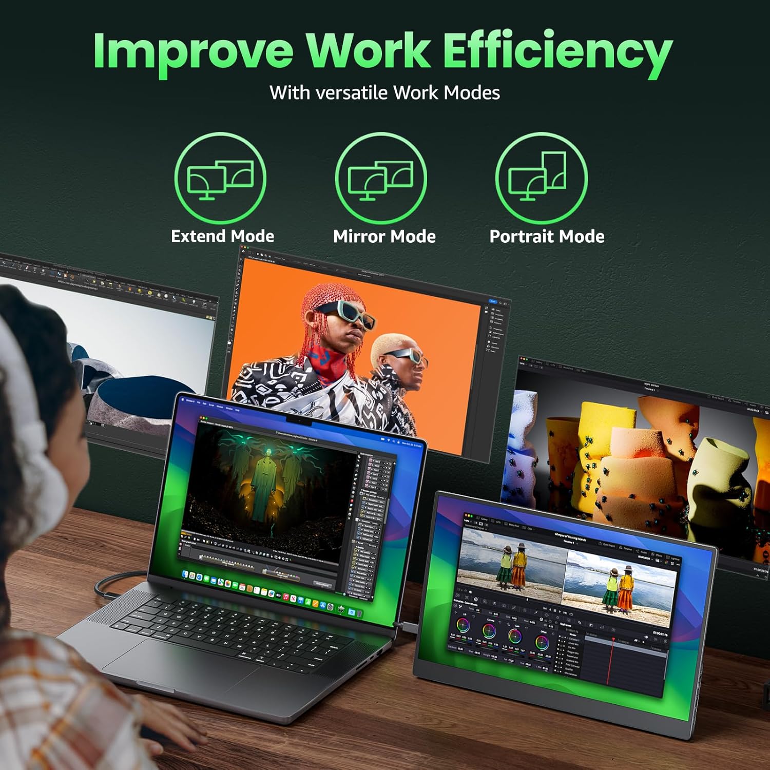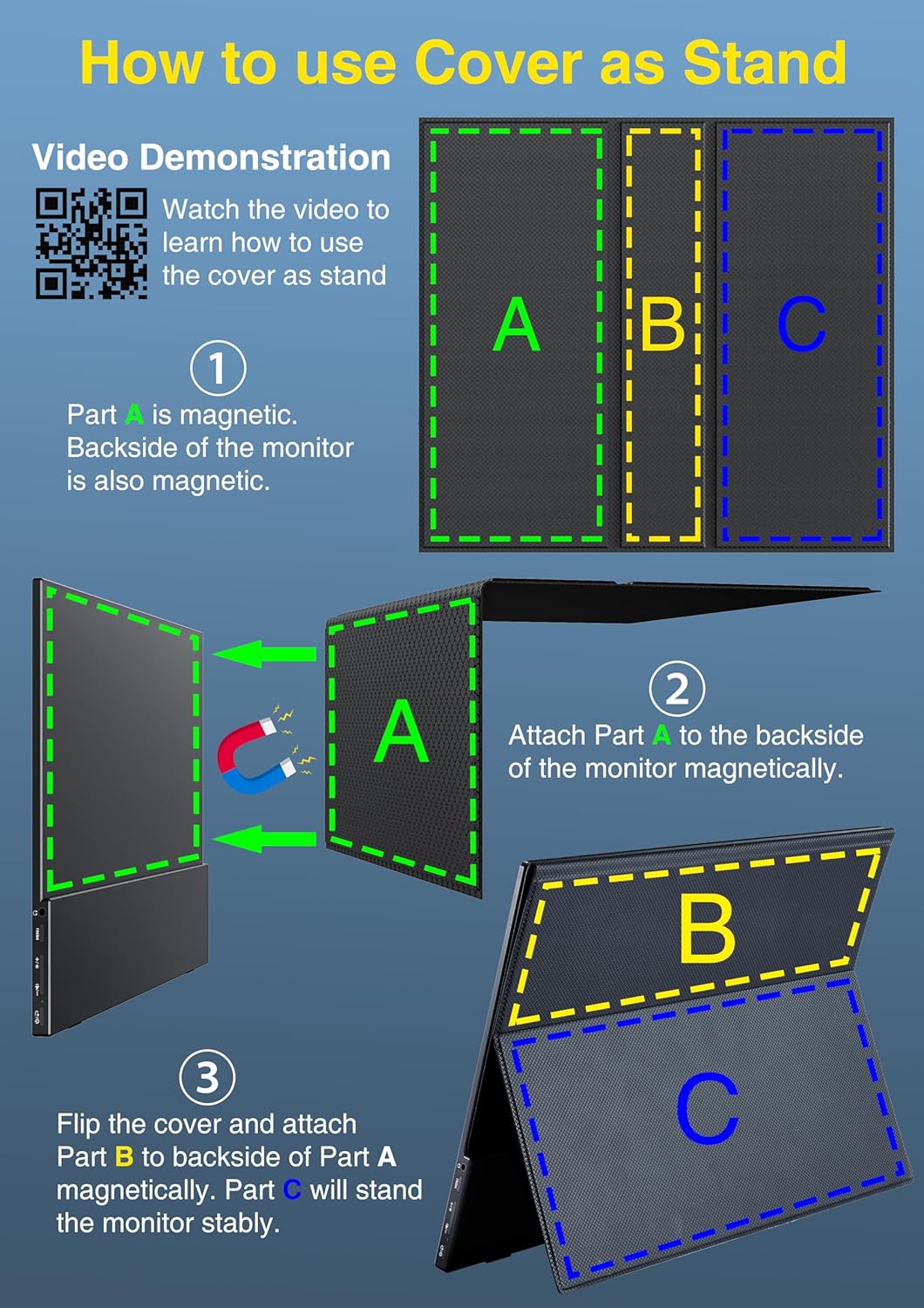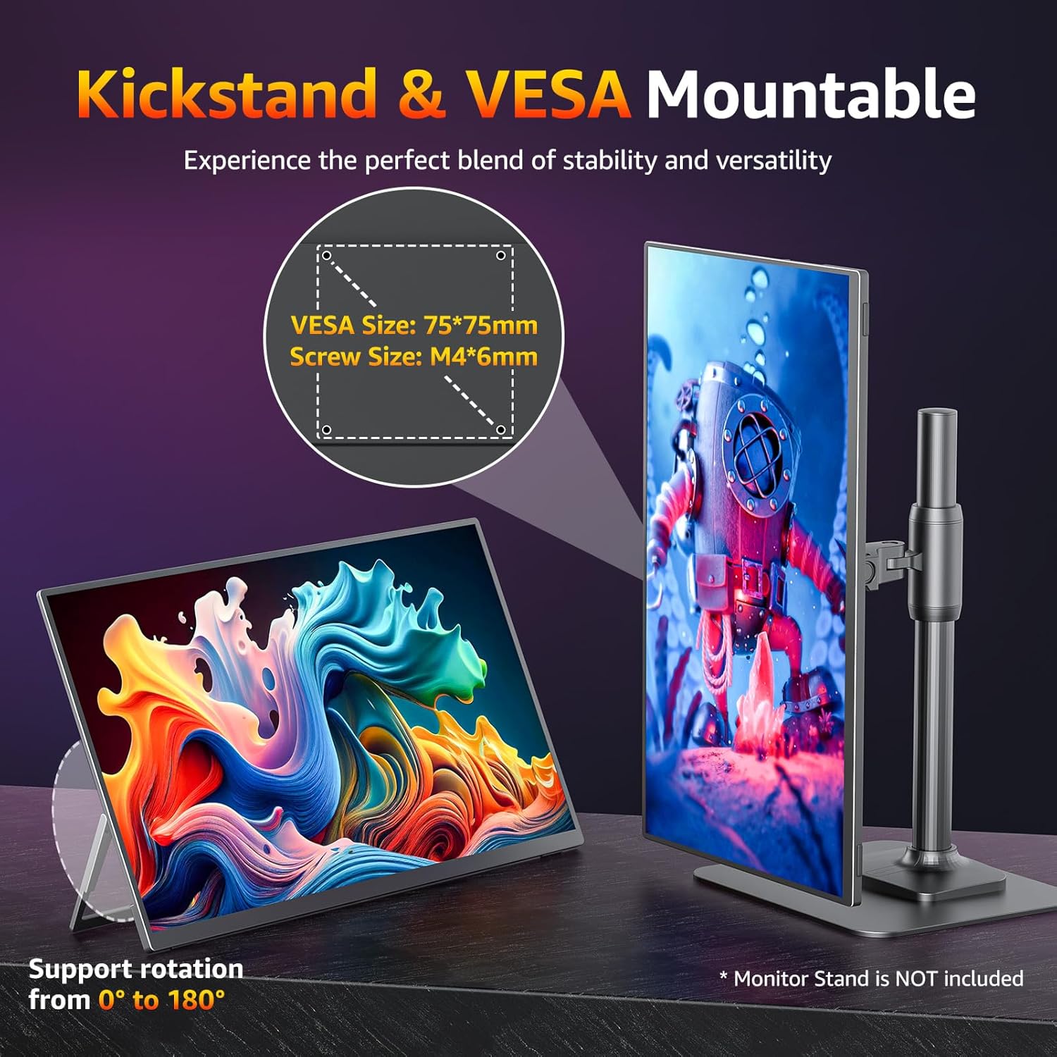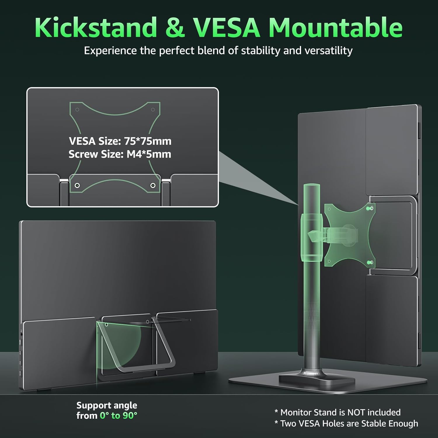 - Adjustable Stand and VESA Mount: Cocopar portable computer monitor setup with ease. The 180° adjustable integrated kickstand lets you personalize the position and angle. Plus, the 4 VESA holes enable stable mounting on compatible stands for efficient space utilization. Customize your workspace for enhanced productivity