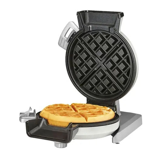 The brushed stainless steel Cuisinart's® Vertical Waffle Maker takes up less room on the counter while making foolproof perfect Belgian waffles. Just add your favorite batter through the spout up to the fill line for consistent waffle thickness, top to bottom and side to side, that won't spill over the edges. Indicator lights and an audible alert, plus five browning levels, guarantee crowd-pleasing waffles are perfectly baked for all your family and friends. Features: • No more overflow unique design ensures no batter leakage • Consistency counts uniform waffle thickness and colour • Perfect timing ready to bake/ready to eat indicator lights • Vertical advantage requires less counter space, easy to store • 800 watts heats fast, cooks fast, perfect results!