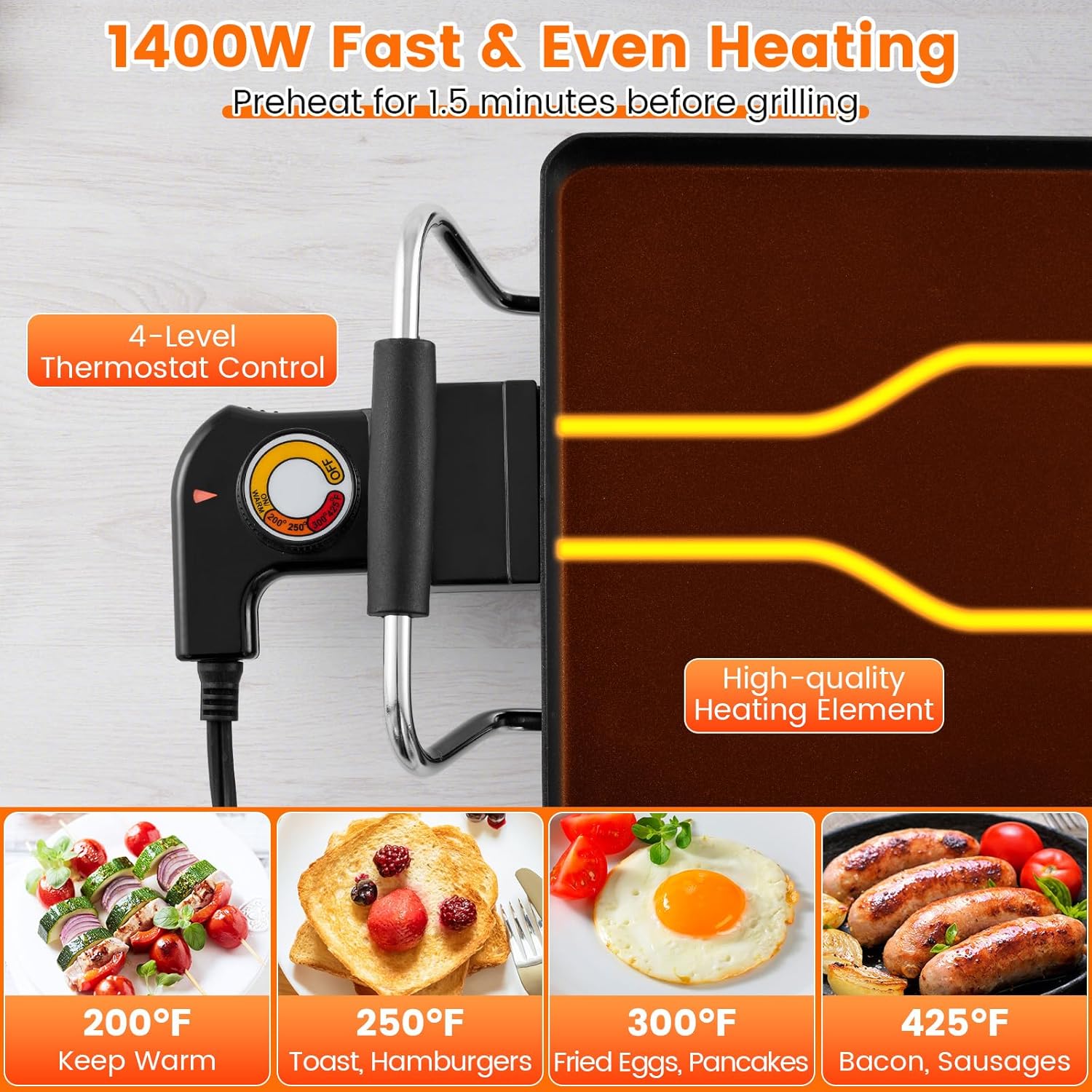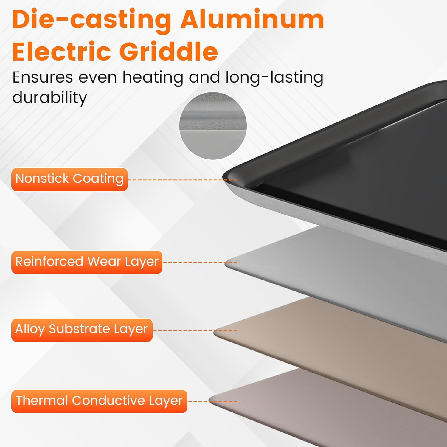 • Superior Heating Efficiency & Durability: Our die-casting aluminum electric griddle ensures even heating with a 1400W power that preheats in just 1.5 minutes. Designed with a nonstick coating surface, reinforced wear layer, alloy substrate layer and a thermal conductive layer, it ensures both effortless cooking and enduring performance.