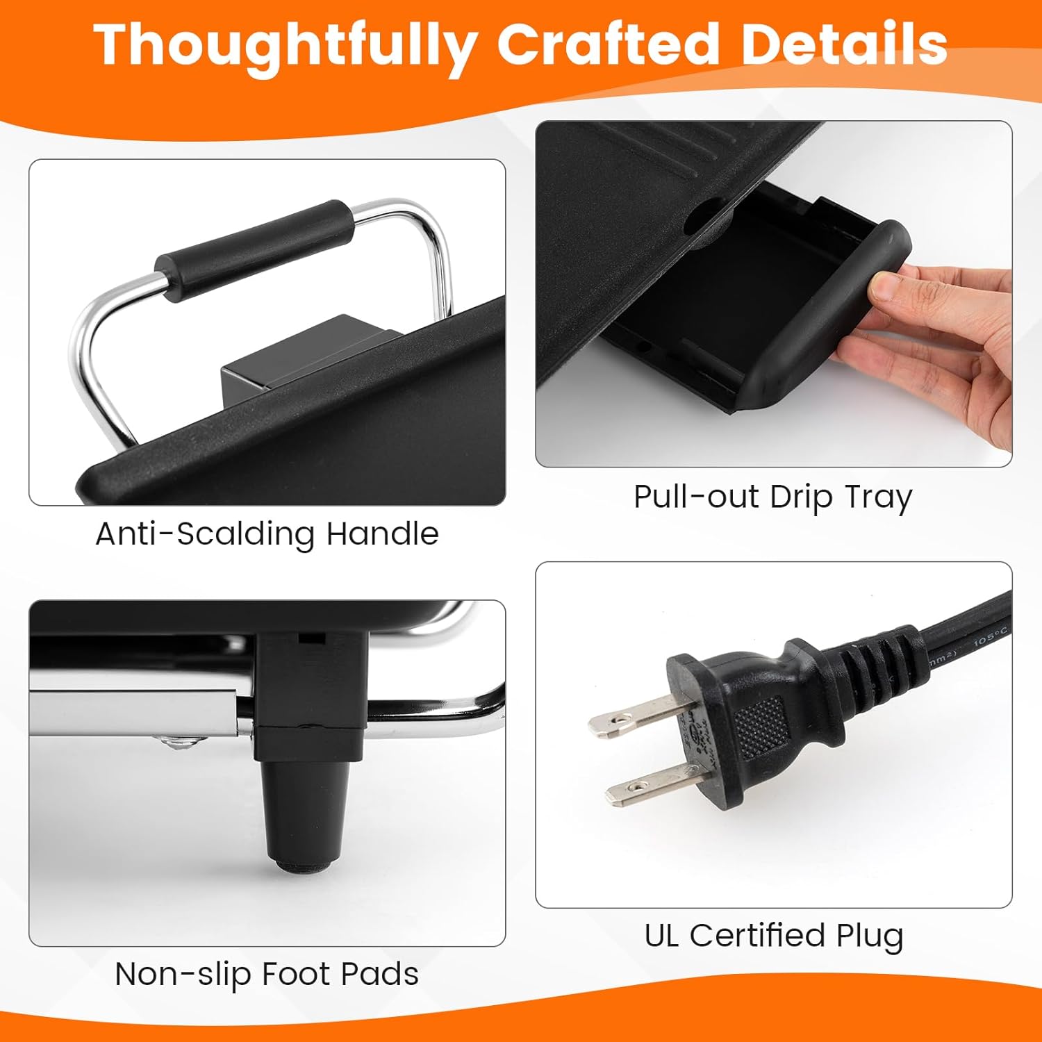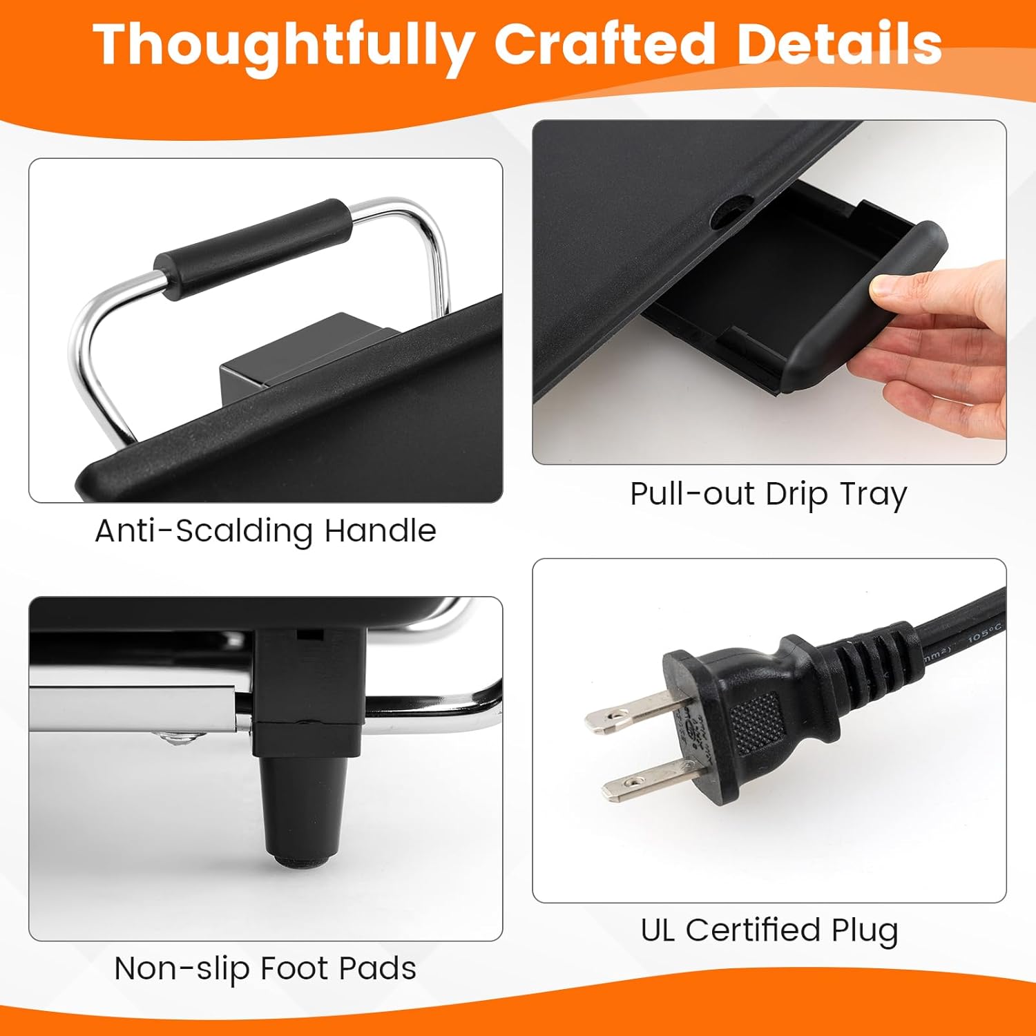 • Thoughtfully Crafted Details: Designed with your safety and convenience in mind, our electric griddle includes an anti-scalding handle, non-slip foot pads to keep the unit stable, and a UL certified plug to ensure electrical safety. Prepare meals with peace of mind, enjoying every step of the cooking process.