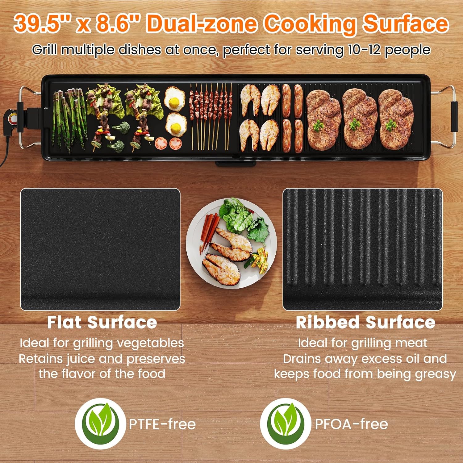 Upgrade your cooking game with this extra large electric griddle! The 39.5'' x 8.6'' dual-zone cooking surface allows you to serve 10-12 people at once, making it perfect for family gatherings, parties, or outdoor barbecues. The flat surface retains juice and preserves the flavor of the food, ideal for grilling vegetables. The ribbed surface drains away excess oil and keeps food from being greasy, ideal for grilling meat. 4 customizable temperature settings meet your various cooking requirements, while the nonstick surface and pull-out drip tray ensure easy cooking and cleaning. Portable and stable, this electric grill is perfect for both indoor and outdoor use.