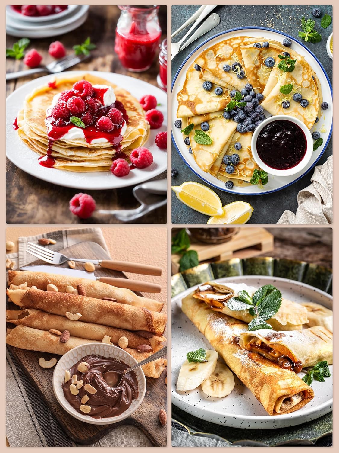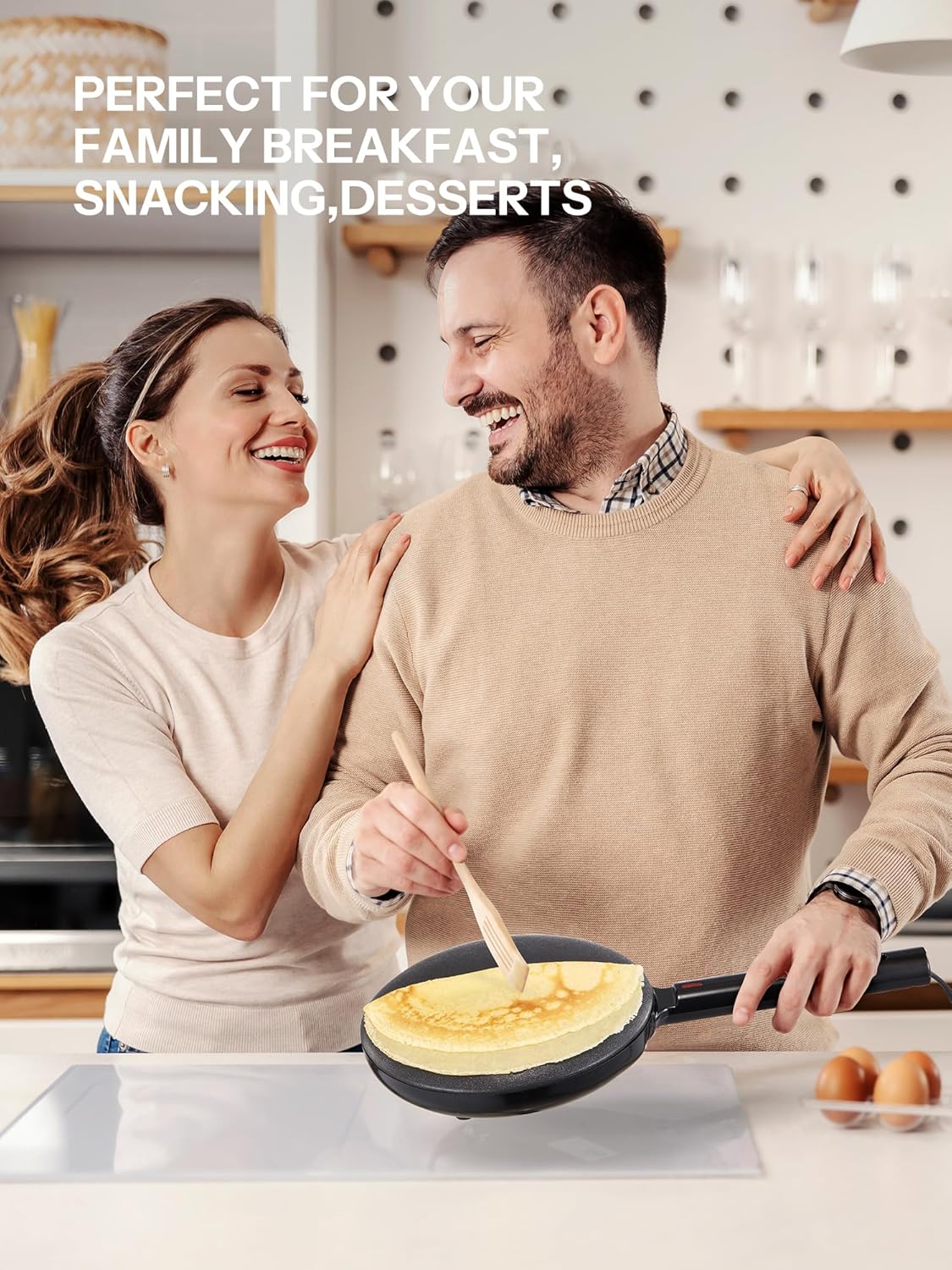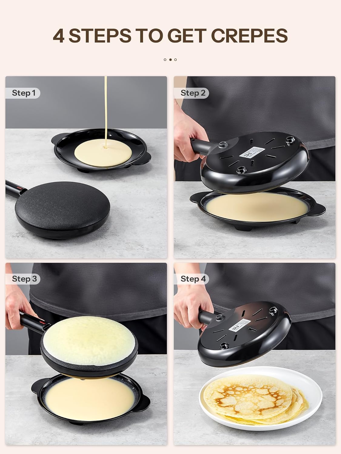 • Temperature Control: Our electric crepes maker with an automatic temperature controller prevents burning. just need to wait for the machine's preheating light to go off, then spread a thin layer of batter, and watch your crepe cook in seconds.