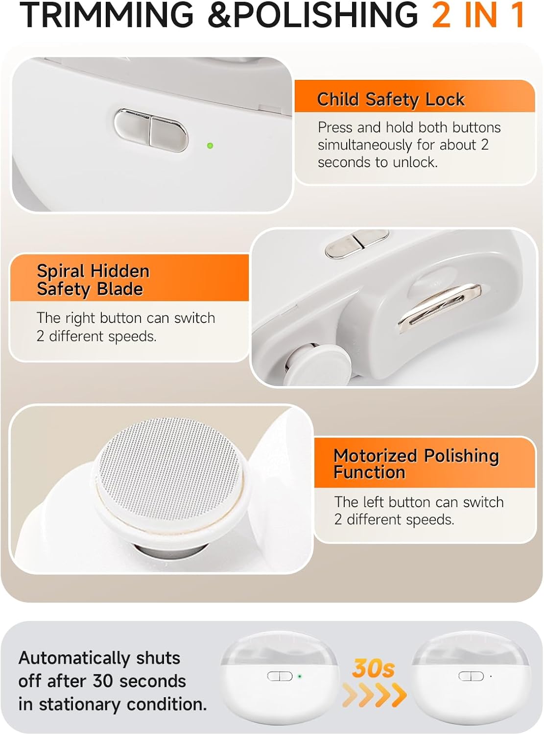 𝟯-𝗶𝗻-𝟭 𝗘𝗹𝗲𝗰𝘁𝗿𝗶𝗰 𝗡𝗮𝗶𝗹 𝗖𝗹𝗶𝗽𝗽𝗲𝗿: Our finger nail clipper combines trimming, grinding and polishing in one. Long press the double button to turn it on. It is designed to make trimming nails simple and efficient, and say goodbye to the trouble of traditional nail clippers. Note: This automatic nail clipper is only suitable for trimming fingernails, not for toenails