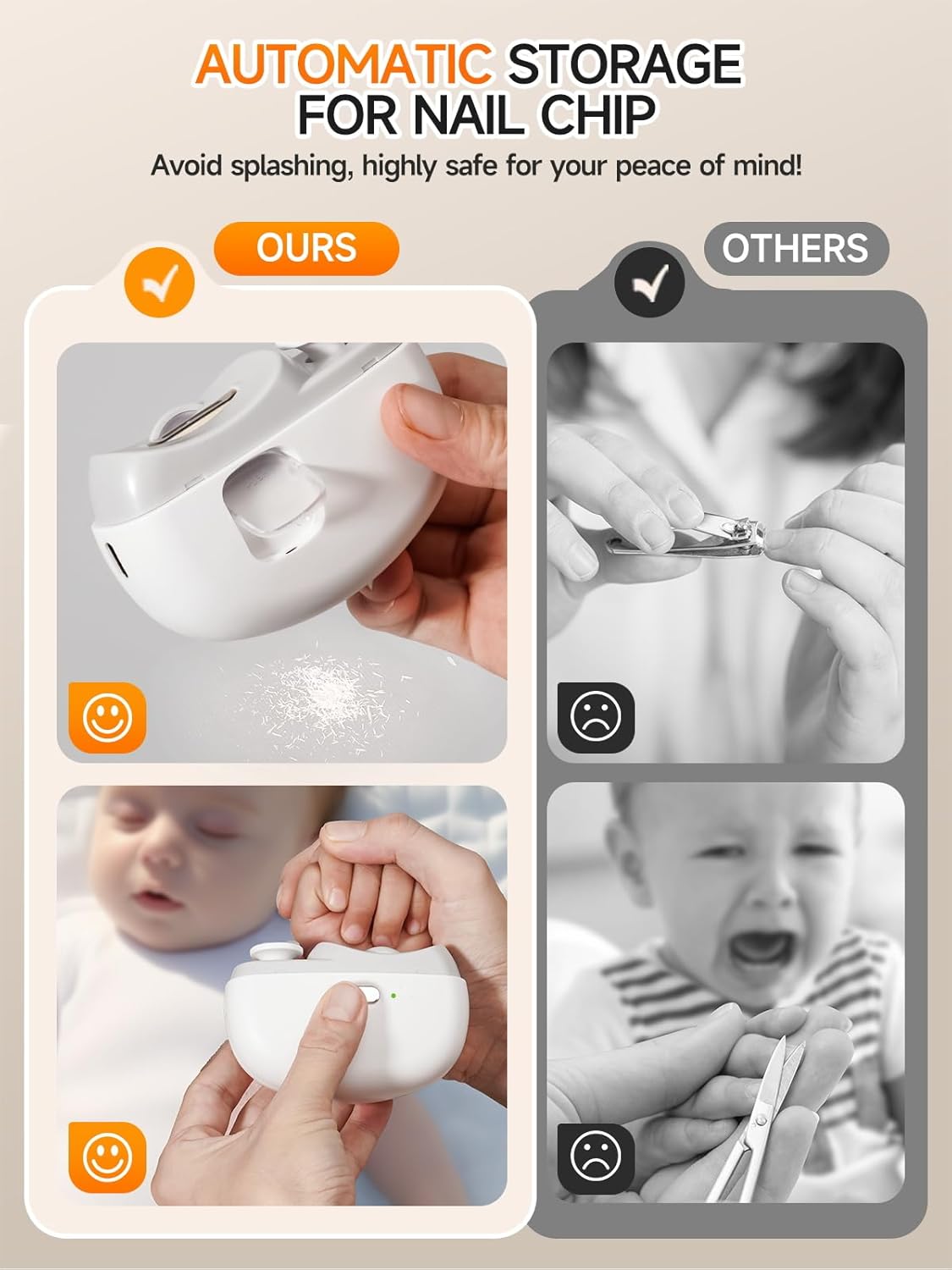 𝗔𝘂𝘁𝗼𝗺𝗮𝘁𝗶𝗰 𝗦𝘁𝗼𝗿𝗮𝗴𝗲 𝗼𝗳 𝗡𝗮𝗶𝗹 𝗖𝗹𝗶𝗽𝗽𝗶𝗻𝗴𝘀: The toddler nail clipper has a built-in nail storage compartment to minimize clutter and simplify cleanup, no more time spent looking for flying nail clippings. After use, you only need to press down hard on the upper part of the storage box window to pour out the nail clippings and clean it with a small brush