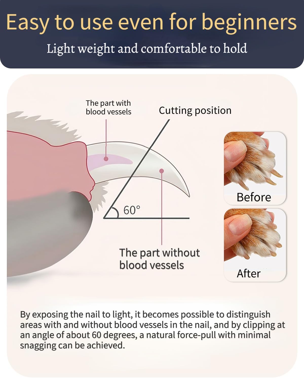 ✅[Safer with LED light] The ultra-bright LED light illuminates your pet's nails, making the veins clearly visible. This avoids excessive sharpening and the risk of hurting your pet. It can be used safely in dark places to clean paw for dogs.