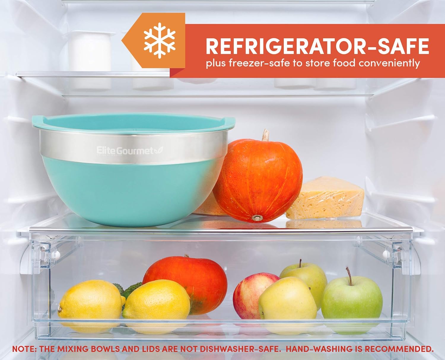 The Elite Gourmet 12 piece mixing bowl set is the smart solution for storing leftovers, food prep/mixing, or taking meals on the go! This set includes an array of 6 colorful bowls and matching lids in a variety of sizes. The set includes one 7.25 Qt. bowl, 6Qt. bowl, one 3.5 Qt. bowl, one 3 Qt. bowl, one 2.25 Qt. bowl, and one 2 Qt. bowl. Stainless steel construction won't change the flavor of foods. Set features deep sides help to reduce splatter when mixing. This mixing bowl set provides the functionality, durability, and reliability that customers have come to expect from Elite Gourmet. Dishwasher, freezer, and refrigerator safe.