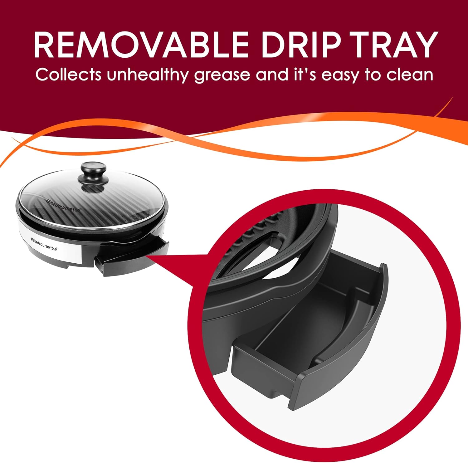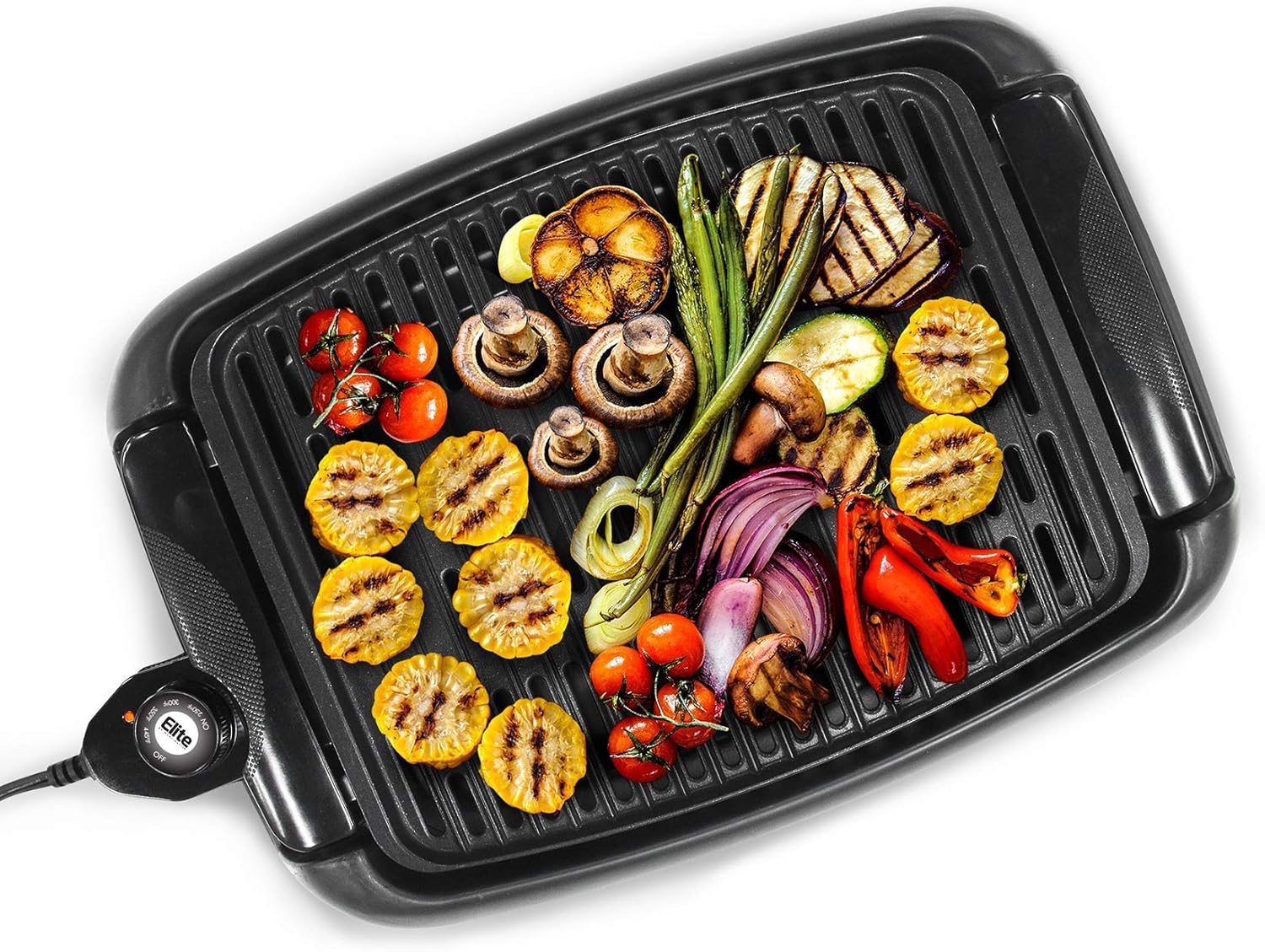 Elite Gourmet EMG6505G Smokeless Indoor Electric BBQ Grill with Glass Lid, Dishwasher Safe, PFOA-Free Nonstick, AdjCatable Temperature, Fast Heat Up, Low-Fat Meals Easy to Clean Design