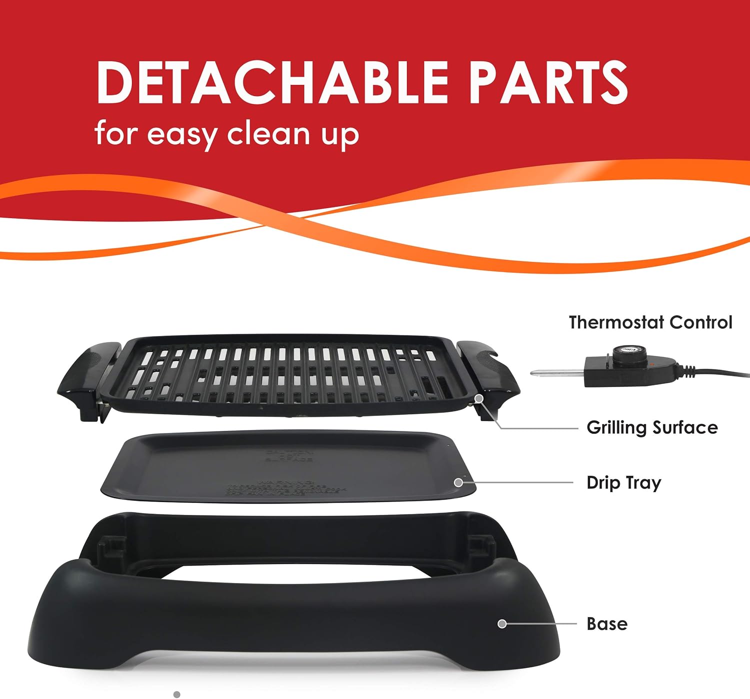 - 1-YEAR WARRANTY – Designed by BBQ lovers for BBQ lovers, this ergonomic and sturdy indoor grill comes with an EXCLUSIVE 1-YEAR WARRANTY! Included removable parts: Grill base, drip tray, extra large non-stick grill plate, tempered glass lid, thermostat control knob, instruction manual with recipe guide