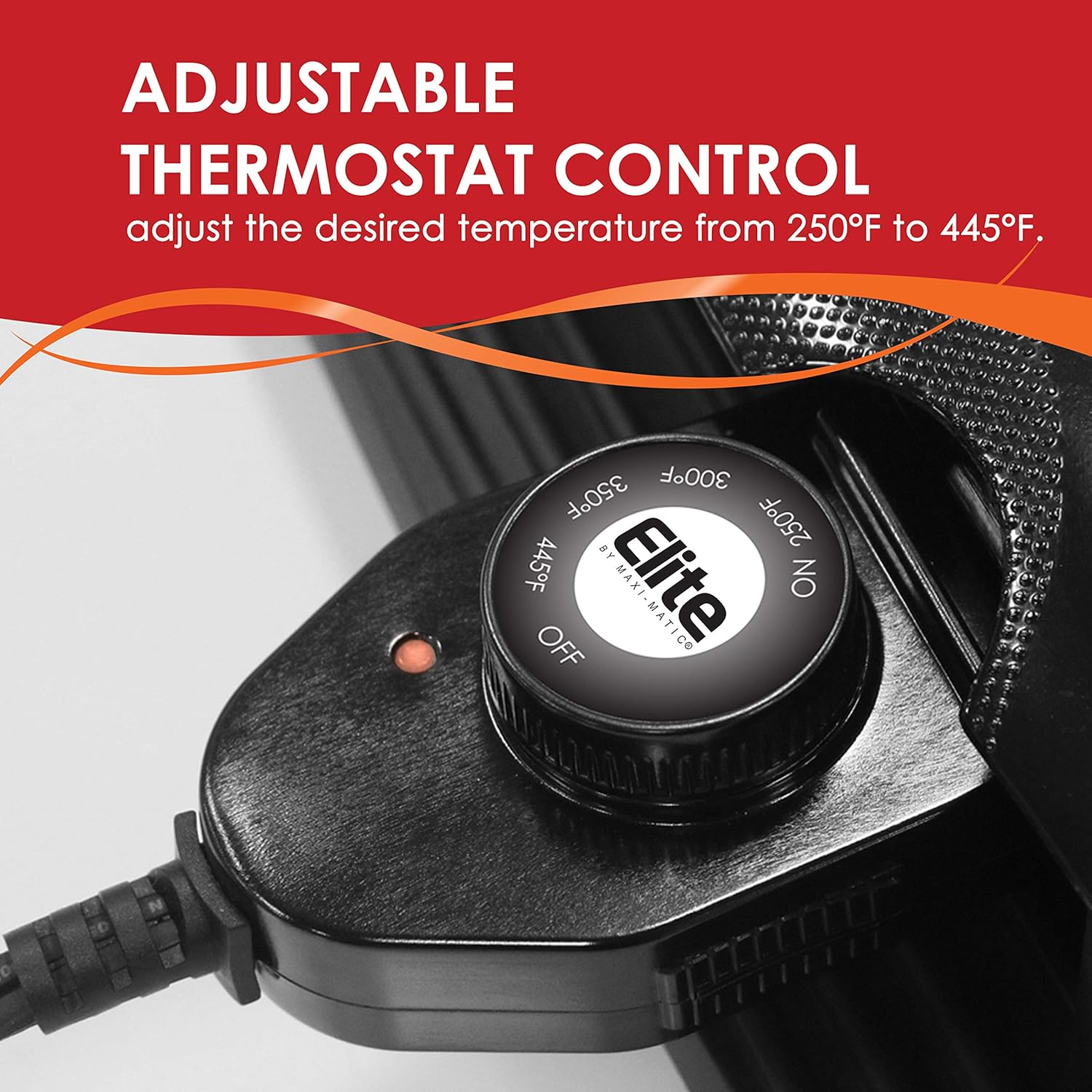 - SAVE TIME & GRILL ALL YOUR FAVORITE FOODS AT ONCE! – Now you can throw your steaks, your wife’s veggies, your son’s ribs and your daughter’s salmon on the large 12" grilling surface at once! And thanks to its reliable PFOA-Free nonstick coating, you’ll never have to deal with stuck food again! Plus, there’s a removable 120V/1200W thermostat control with 5 adjustable settings up to 450°F.