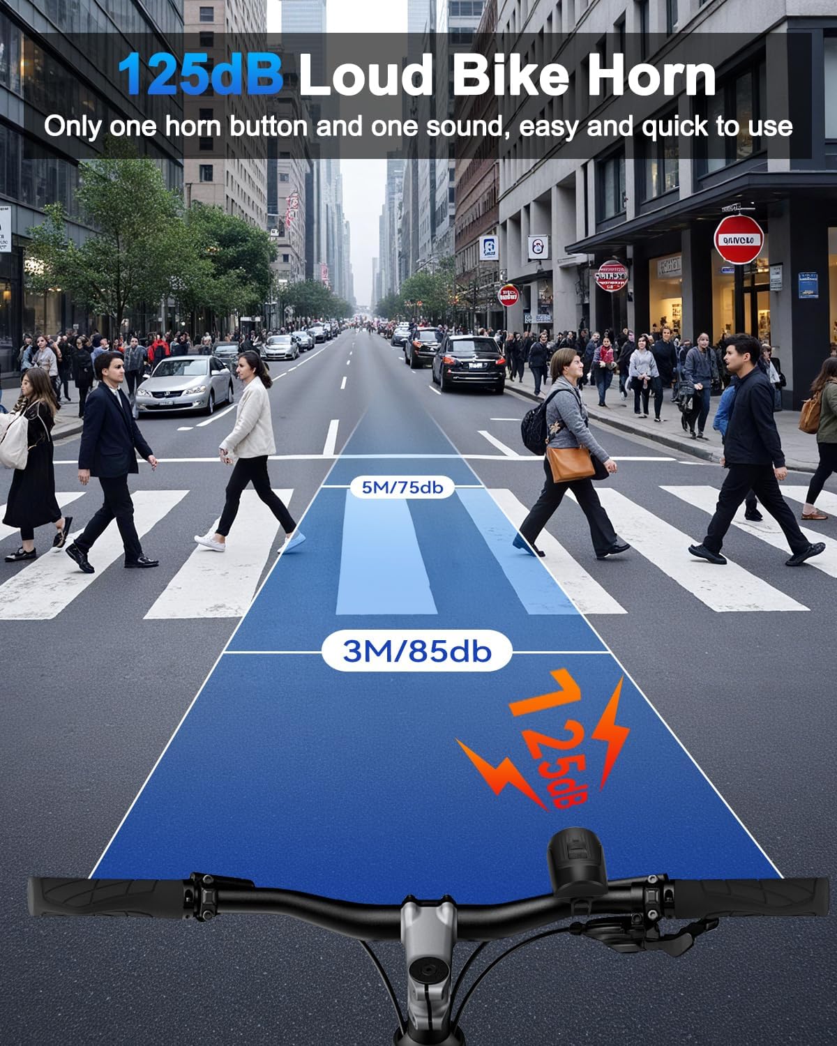 • 125 DB LOUD & CLEAR WARNING: Our bike horn for adults has only one sound mode, the powerful 125dB sound effectively warns pedestrians and vehicles around you, one button quick ring in case of emergency ensures your riding safety on busy streets or trails