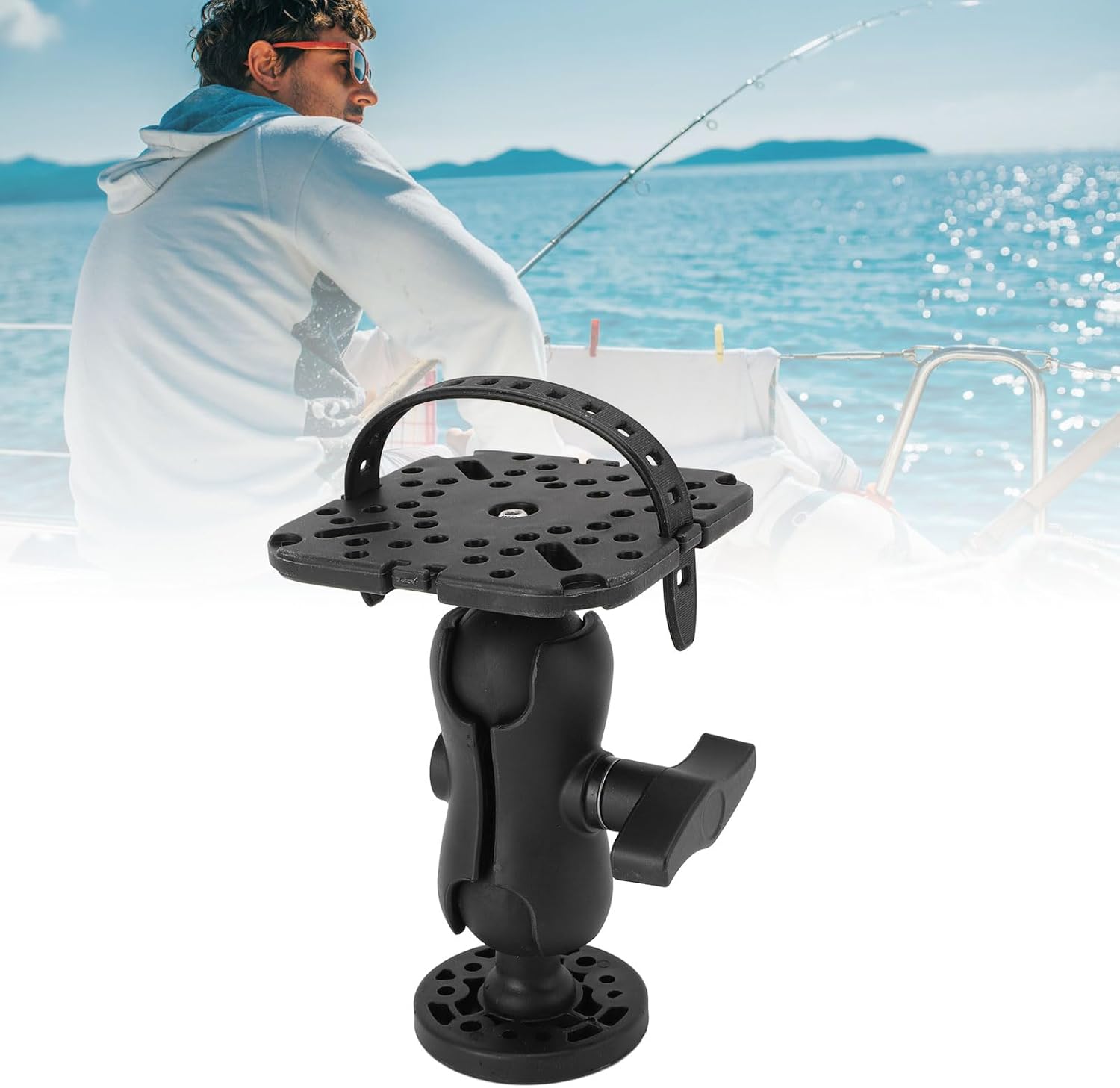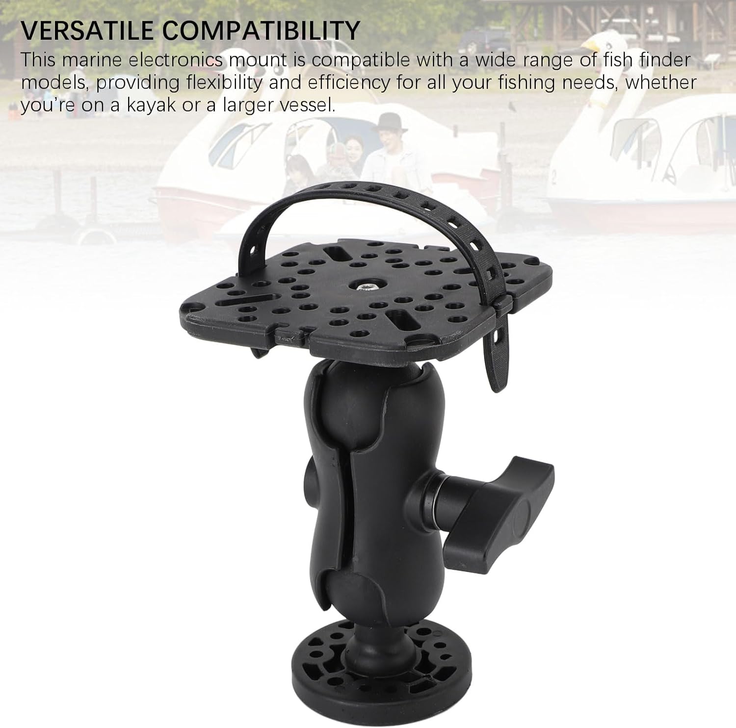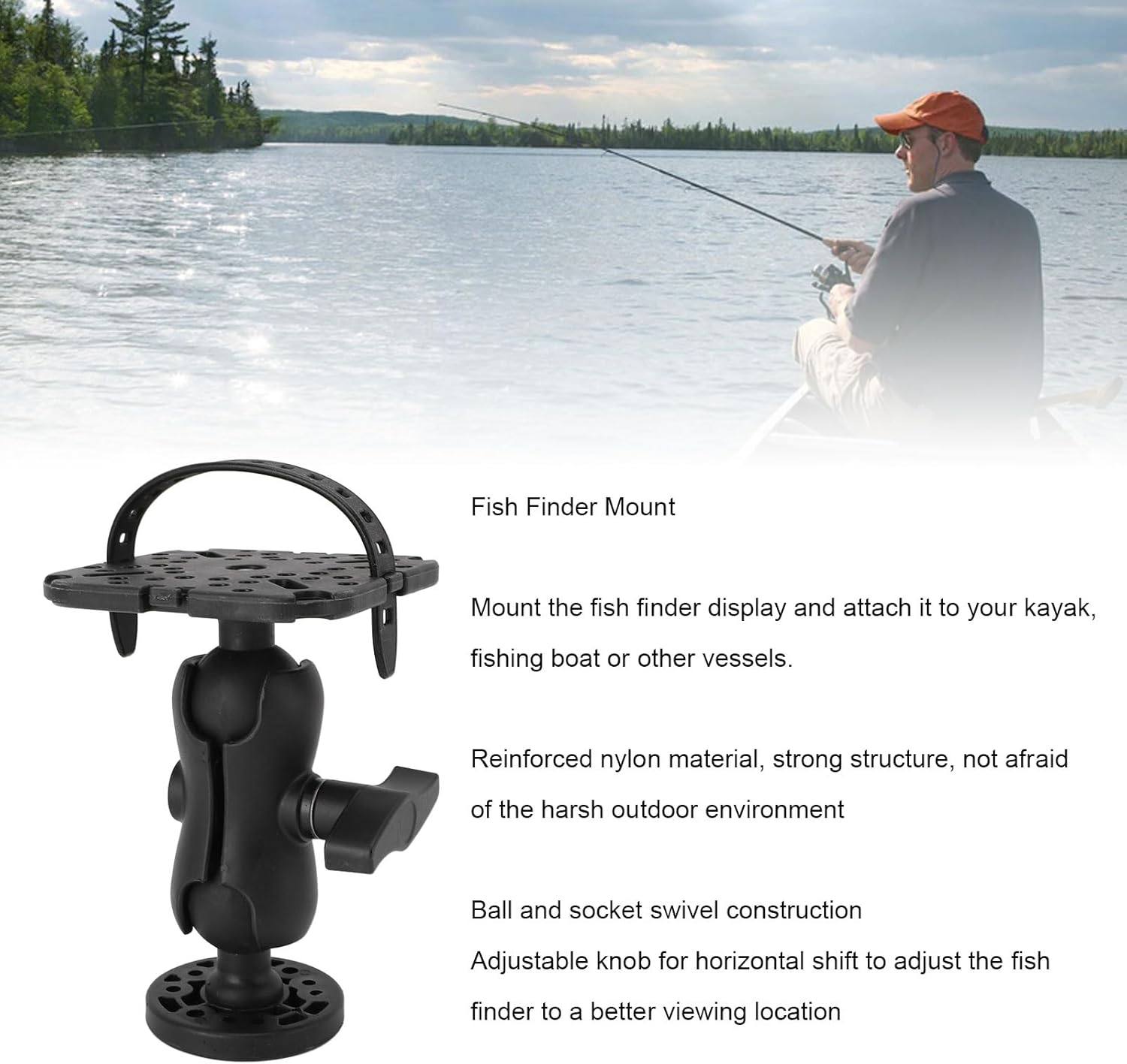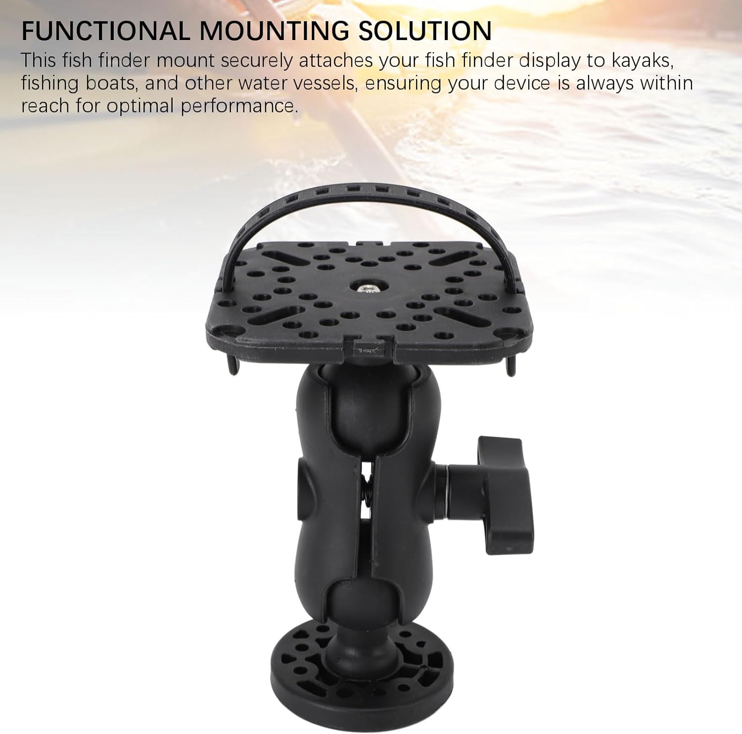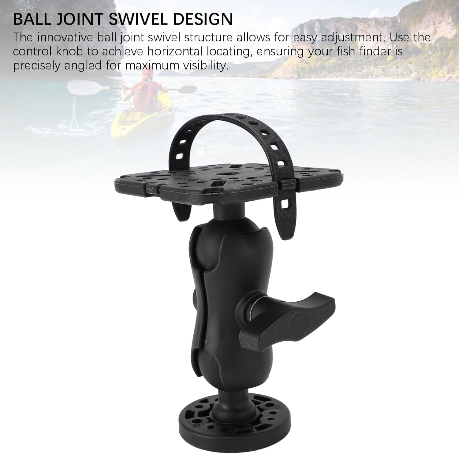 BALL JOINT ROTATION FOR PRECISE ANGLES: The boat fishing accessories ball joint design lets you rotation and adjust the mount horizontally, using a control knob to lock in the ideal angle. Easily position your fish finder for clear visibility, whether you’re seated or standing in a kayak or boat.