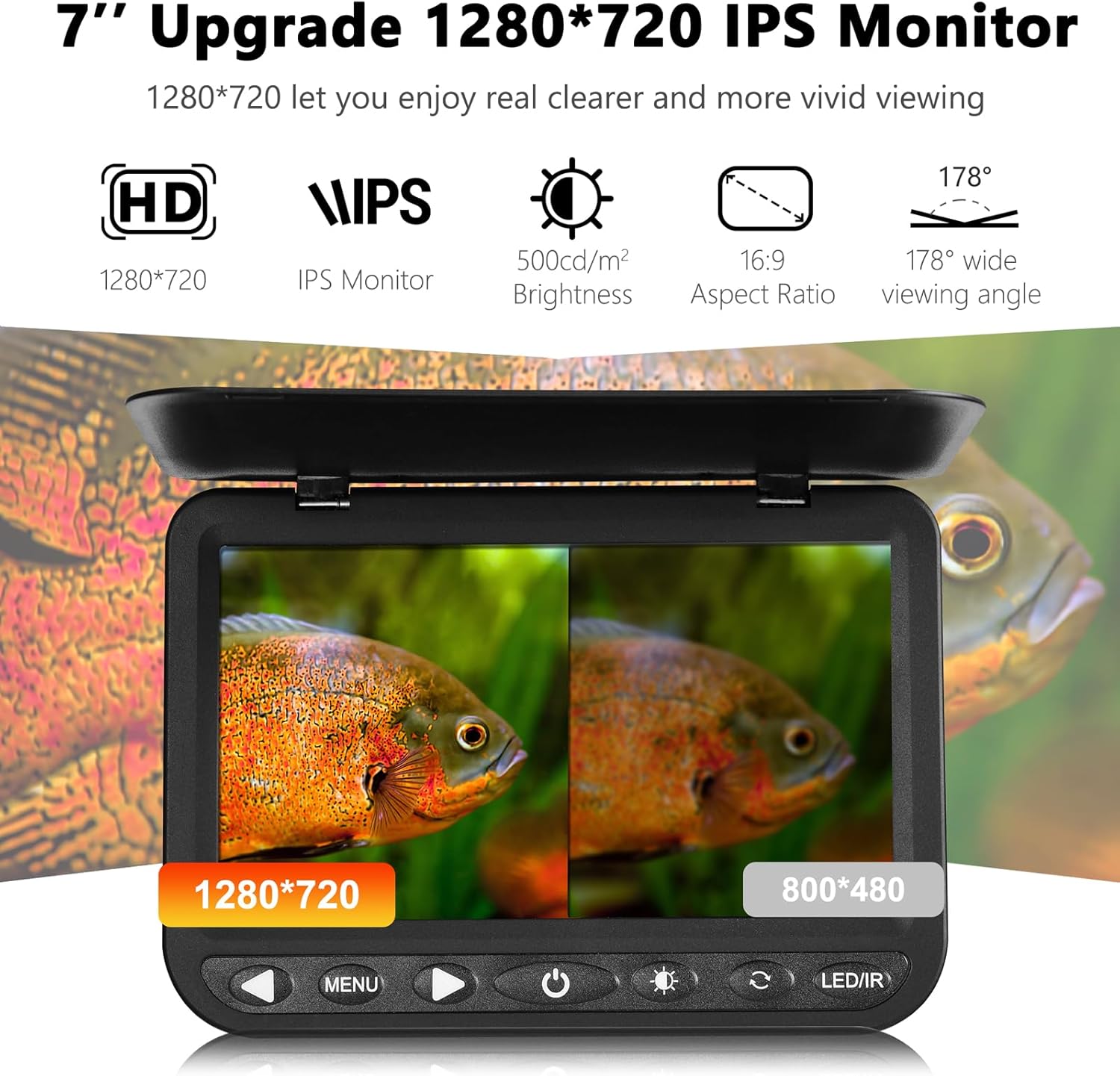 - ✅7-inch IPS Screen, Bigger, Clearer, Catch More Unlike the discolored and blurry LCD screens on the market, our underwater fishing camera features a 7-inch IPS display, providing crystal-clear detail and a larger screen. Lets you see everything underwater, from the moment a fish bites to the movements of a school of fish. No more guessing—watch the fish action, react faster, and fish with precision. See more, fish smarter, and bring home BIGGER catches every trip. Perfect for kayak ice fishing.
