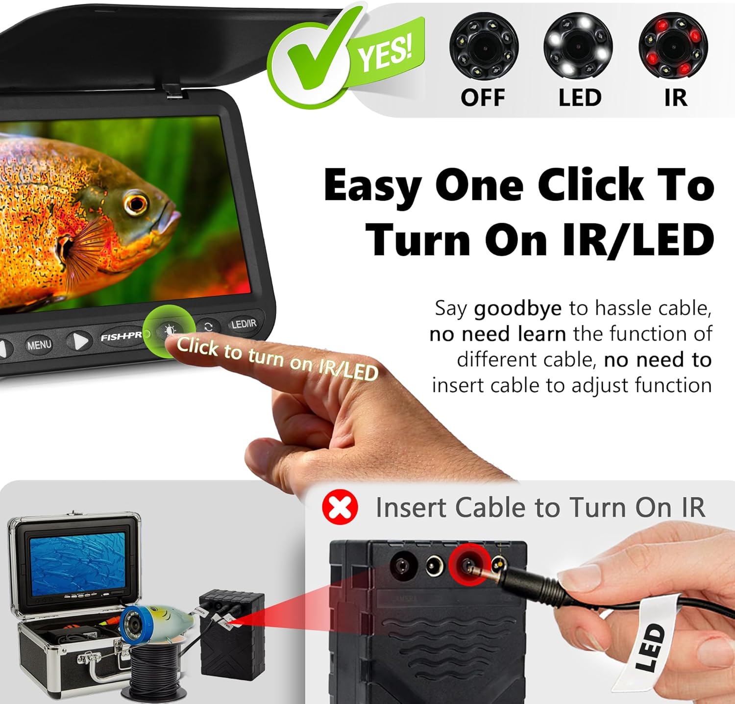 - 💡𝗜𝗥 / 𝗪𝗵𝗶𝘁𝗲 / 𝗡𝗼𝗿𝗺𝗮𝗹 𝟯 Lighting Modes, Easy One Click to Change --- We feature extra 4pcs IR & 4pcs white led lights for murky and dark waters. Unlike competitors you have to plug or unplug a cord just to get LED to work, you just press "LED/IR" button on the monitor of our ice fishing camera underwater, lighting mode changes, so easy! Our underwater camera for fishing uses IR and white lights that fish can't see, it illuminates the dark depths without spooking fish