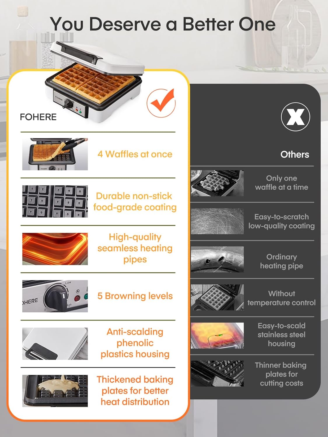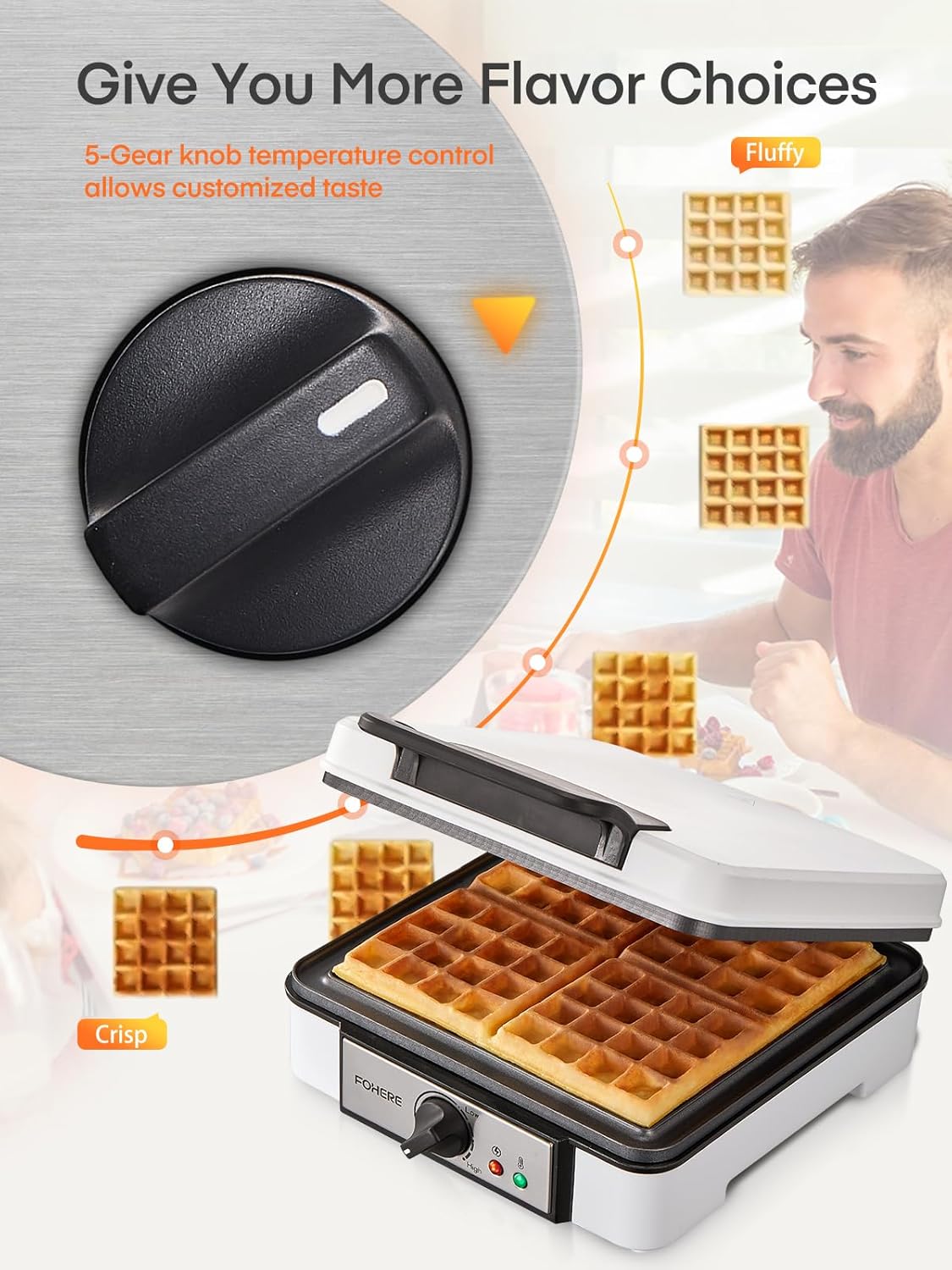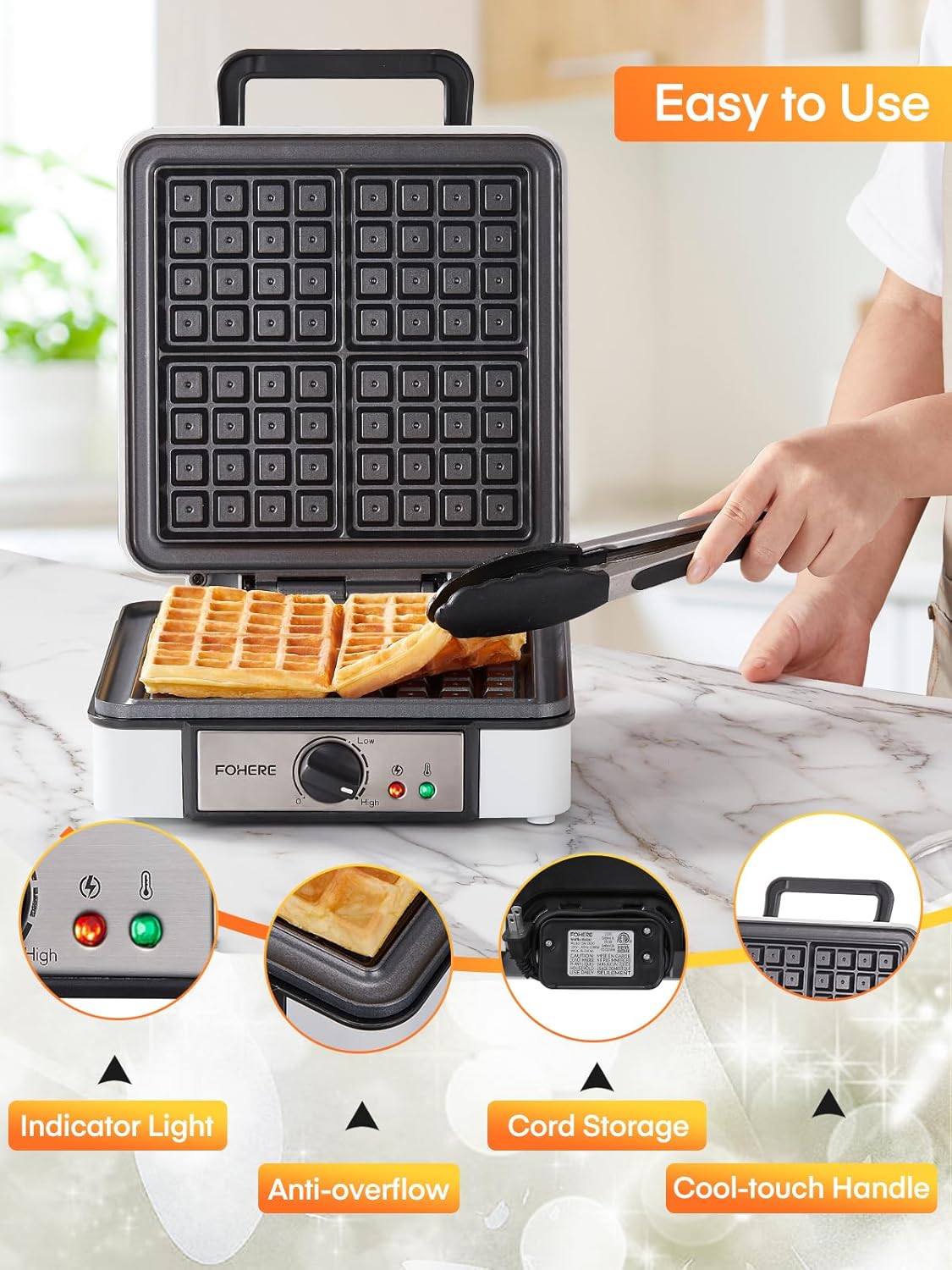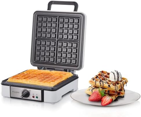 FOHERE Waffle Maker, 4-Slice Waffle Iron, Square Belgian Waffle Maker, with 5 Browning Levels, Non-Stick Plates, Indicator Lights, Cool Touch Handle, Recipe, 1200W (White)PL17-B0DPWCCJ1Q