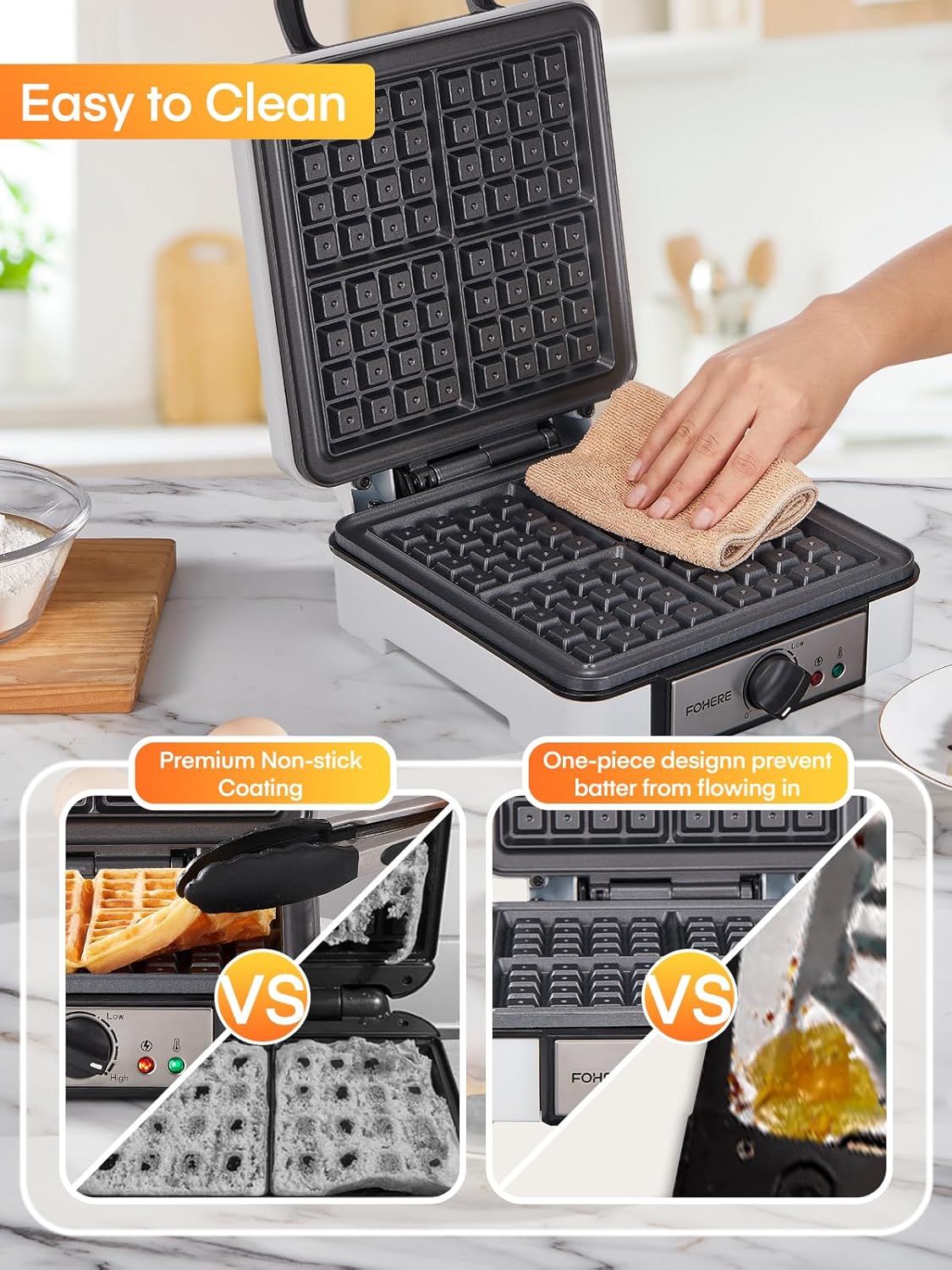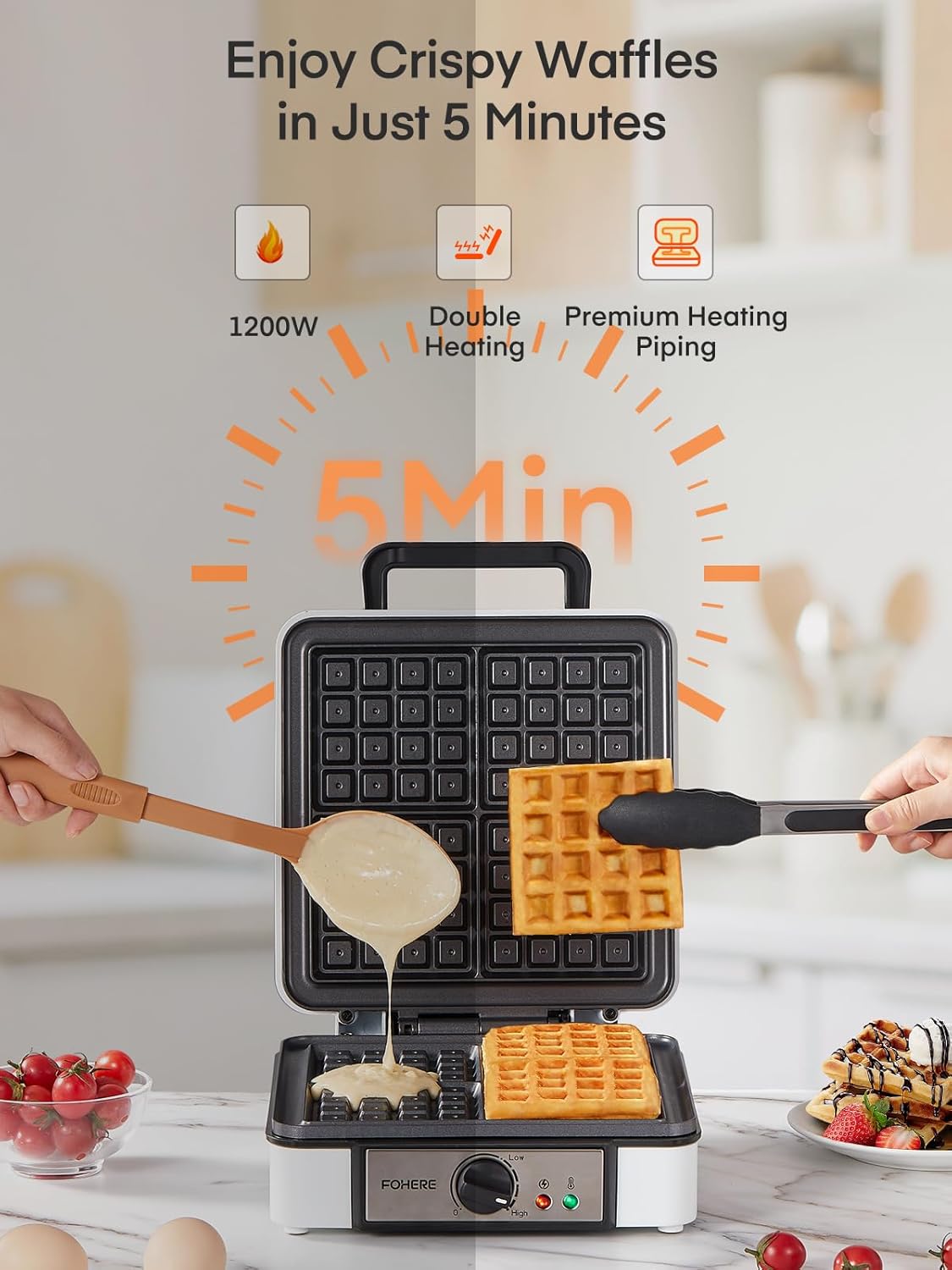 • 【4-Slice Waffle Maker】1200w fast heating waffle iron allows you to getting four 4"x4" delicious Belgian waffles simultaneously in 4-5 minutes, saving your time when preparing breakfast. This allows you to enjoy your tasty waffles more easily, perfect for your family.