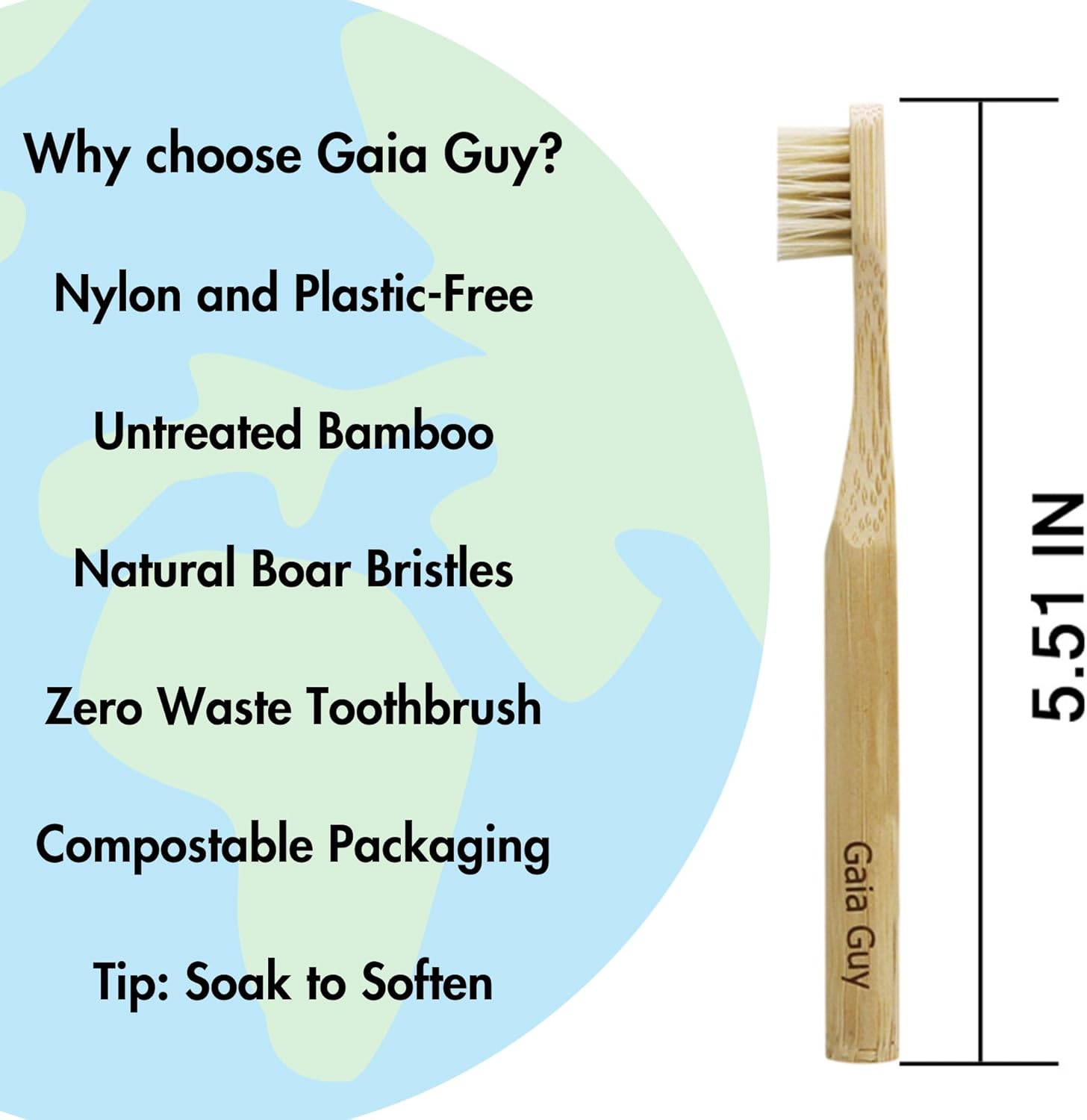 Gaia Guy Natural Bristle Bamboo Toothbrush for Kids (NO Nylon - Boar Hair ONLY) - Totally Compostable & Biodegradable Boar Bristle and Bamboo Toothbrushes - Zero Waste - 6-Pack