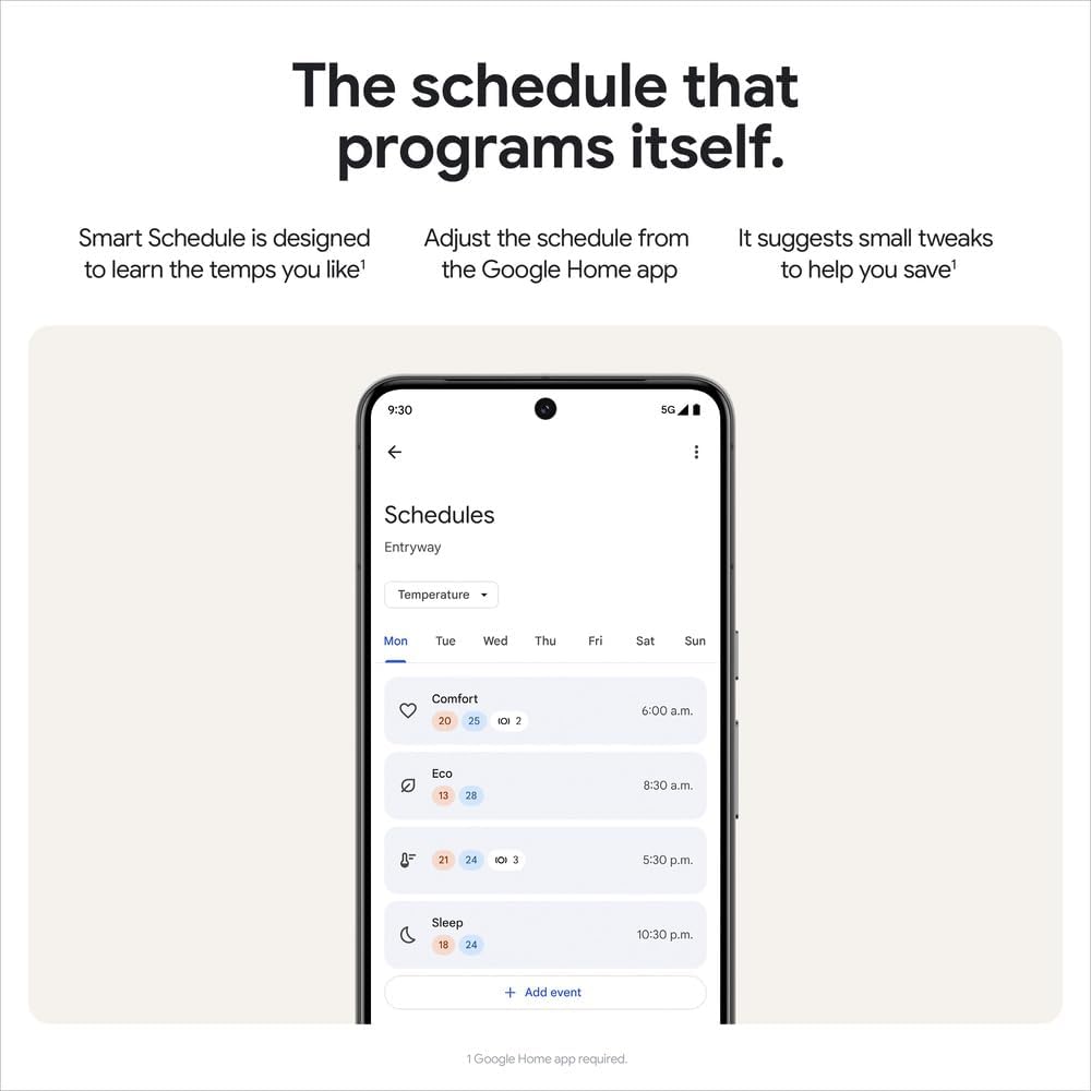 Smart Schedule learns the temps you like, and when you like them; it suggests tweaks to help you save, and you can accept them in the app[1]; and Adaptive Eco helps find an energy-saving temperature, based on the temperature outside[1]