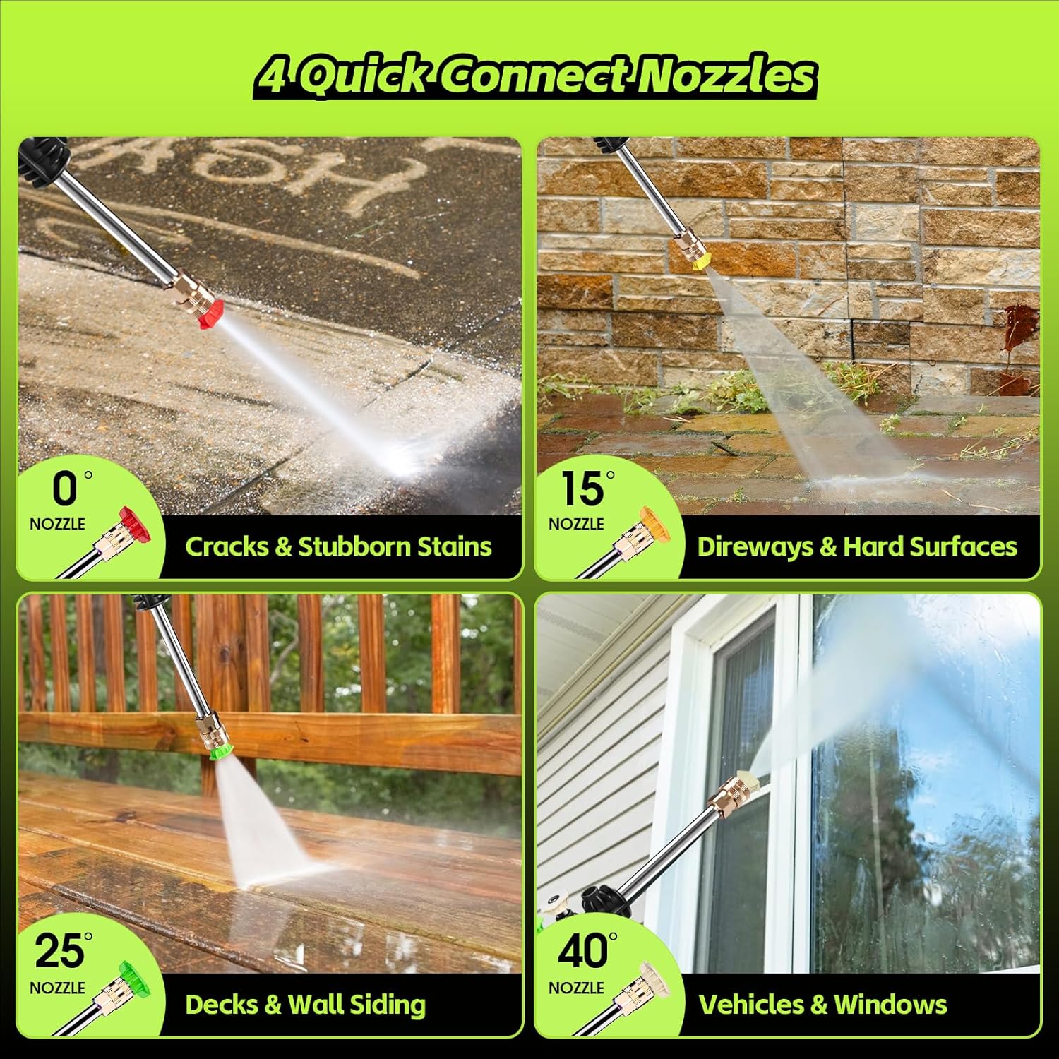 • 【VERSATILE CLEANING】4 Quick-Connect Metal Nozzles + Foam Cannon =Extensive cleaning capabilities for multiple tasks. The 4 metal nozzles have different pressure strengths for different application scenarios to meet your cleaning needs. The foam cannon can be filled with car wash soap, bleach and other chemical cleaners to improve cleaning efficiency