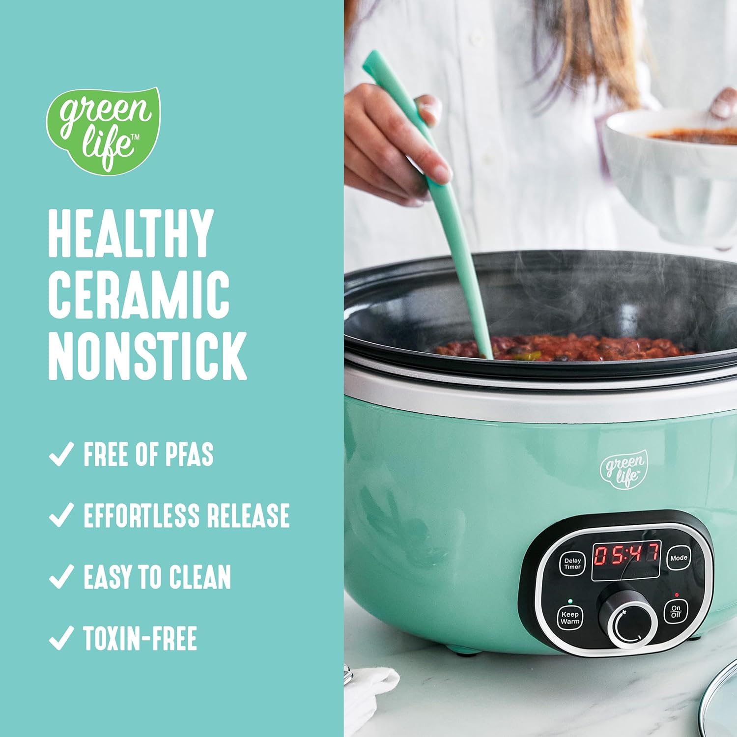 GreenLife 6QT Ceramic Slow Cooker, PFAS-Free, Programmable, Removable Healthy Nonstick Pot for Family Meals, Sear on Stovetop, Keep Warm, Digital Timer, Dishwasher Safe Glass Lid, Turquoise