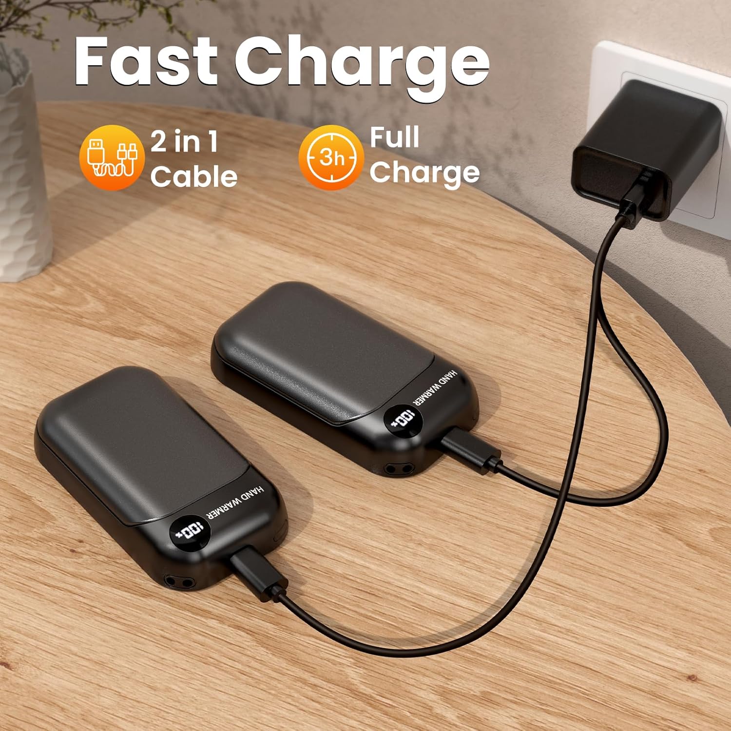 Charging is fast and convenient thanks to the included Type-C 2-in-1 USB cable. Charge both warmers together in about 4 hours, or a single warmer in just 3 hours. Crafted from high-quality aluminum alloy and fire-resistant ABS, they include essential safety protections—overheat protection, short-circuit protection, and overcurrent safeguards—supported by certifications such as FCC and CE.