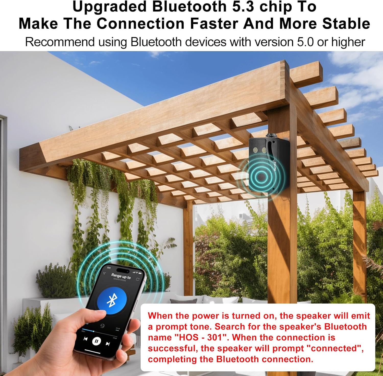 - 【BLUETOOTH 5.3 TECHNOLOGY】This bluetooth outdoor speaker features one active speaker and one passive speaker. The active speaker features a built-in bluetooth amplifier can provide more stable connections and better audio transmission under difficult conditions. And the wireless connection range is up to 30 feet