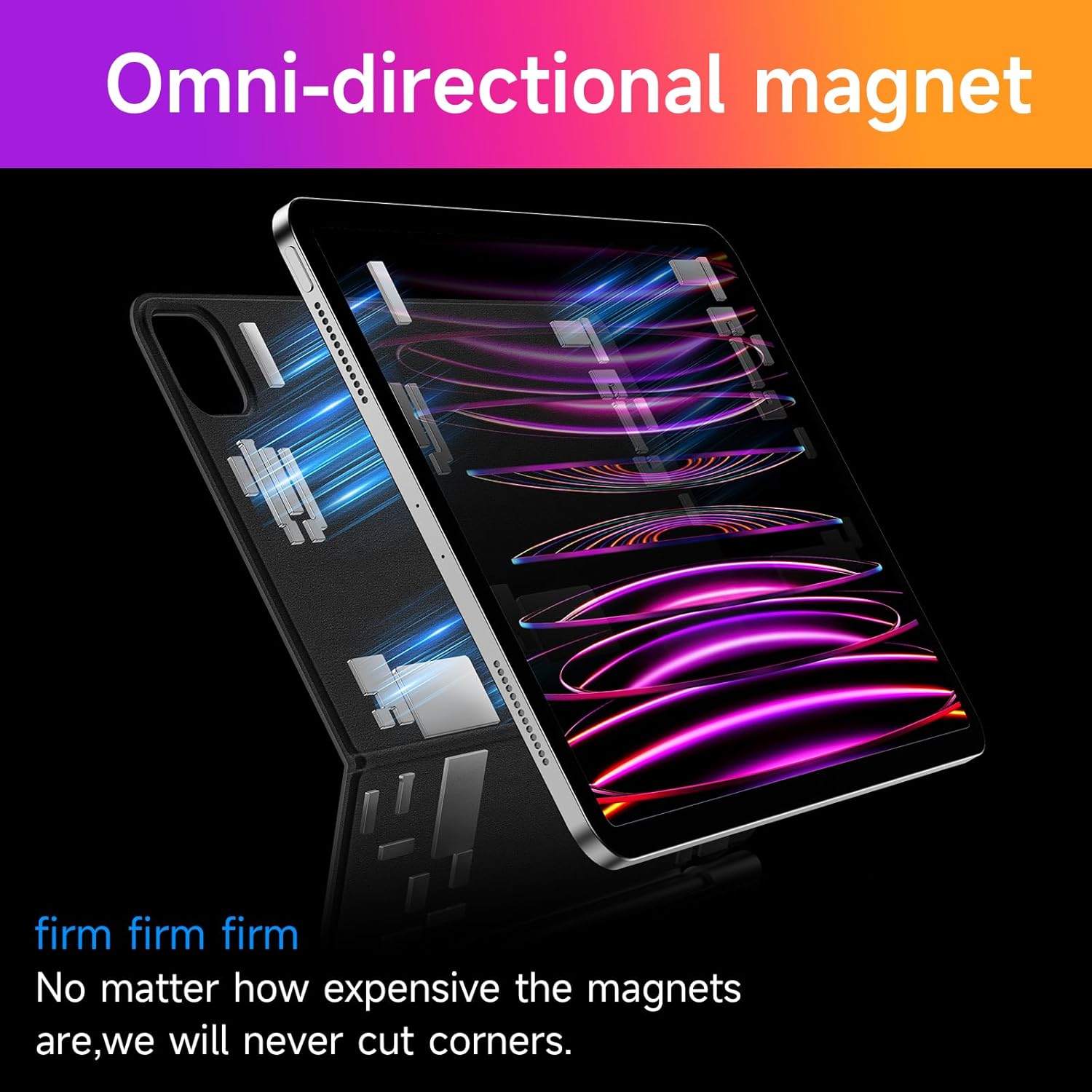 【Floating Cantilever Stand】Adopt magnetic suspension design,strong magnetic suction to ensure the safety of your iPad.Ergonomically floating cantilever stand[adjustable 135° angle],you can choose the most comfortable tilt angle to use your iPad.You can also wake up or sleep your iPad by opening or closing your keyboard case.