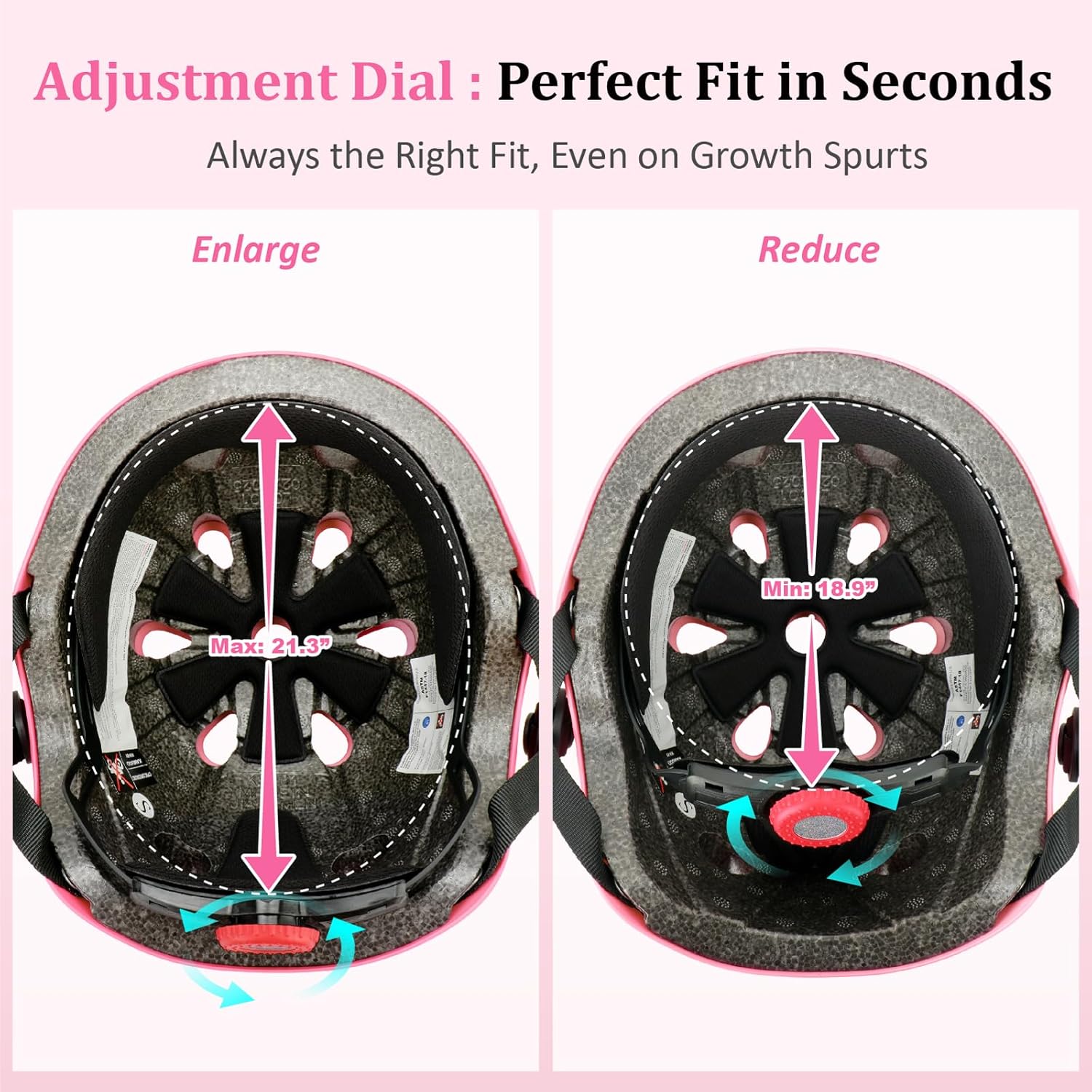 - Fitted Kids Helmet:While every other kid bicycle helmet appears loose and does not fit your child's head perfectly, our kids helmet for 2 - 8 years old comes with an adjustable harness/wheel ratchet that can be adjusted to fit heads measuring 18.9 - 21.3 inches