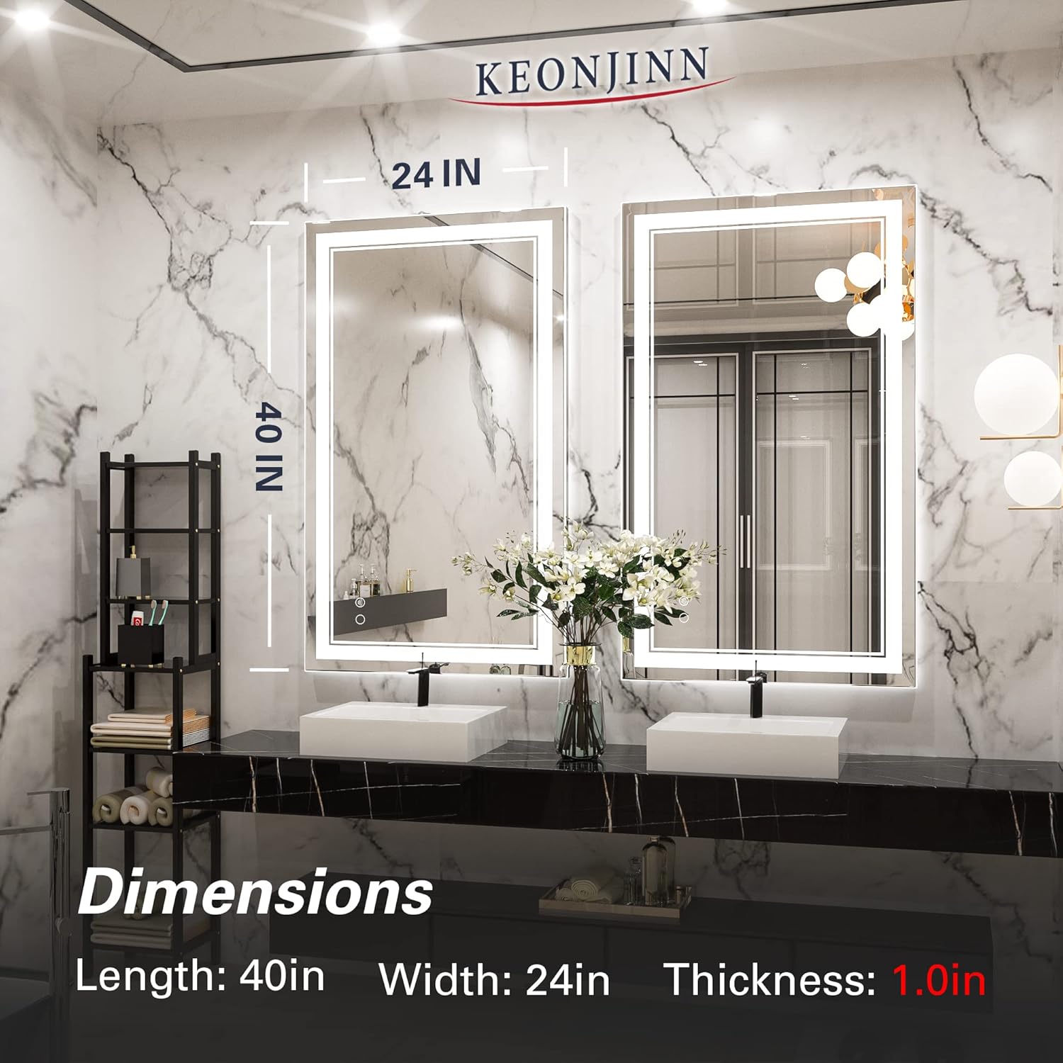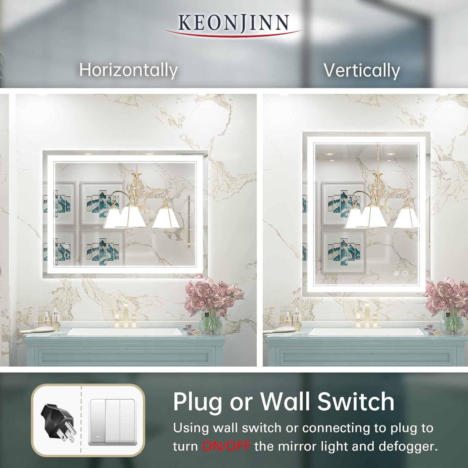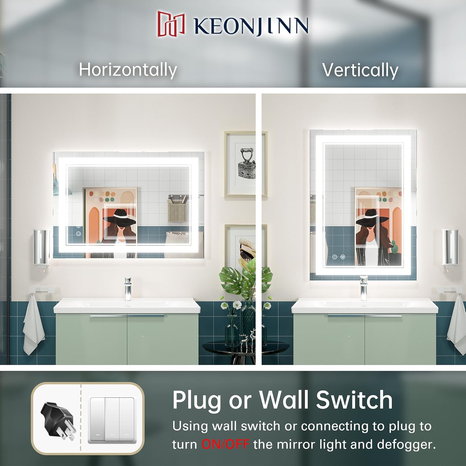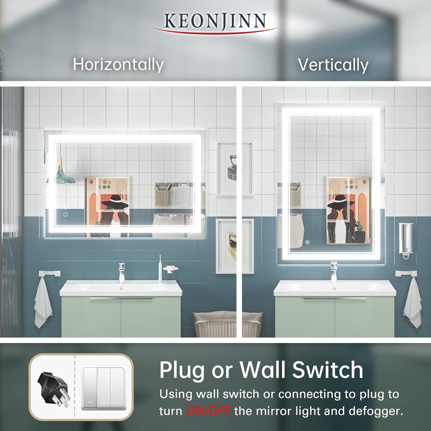 Keonjinn 40 x 24 Inch LED Mirror, Bathroom Mirror with Lights, LED Vanity Mirror, Wall Mounted Anti-Fog Dimmable Lighted Makeup Mirror for Bedroom, IP54 Waterproof (Horizontal/Vertical)PL17-B078SNSZHZ