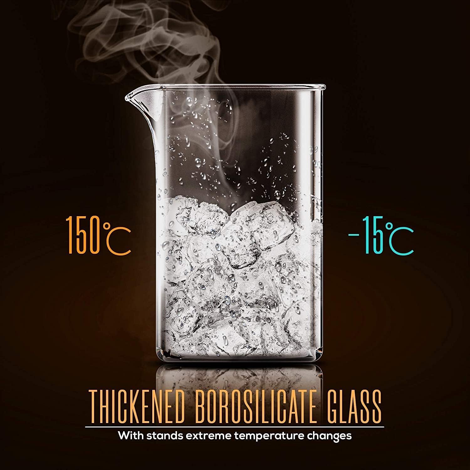 Durable, heat-resistant borosilicate glass carafe mug sits in stylish insulated plastic frames which make pouring coffee easier and prevent wobbling.