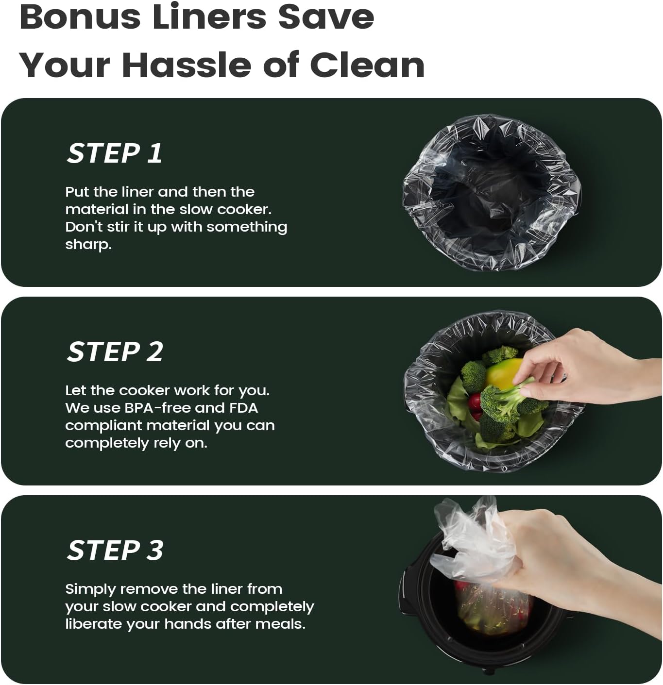 KOOC Small Slow Cooker, 2-Quart, Free Liners Included for Easy Clean-up, Upgraded Ceramic Pot, Adjustable Temp, Nutrient Loss Reduction, Stainless Steel, Black, Round…