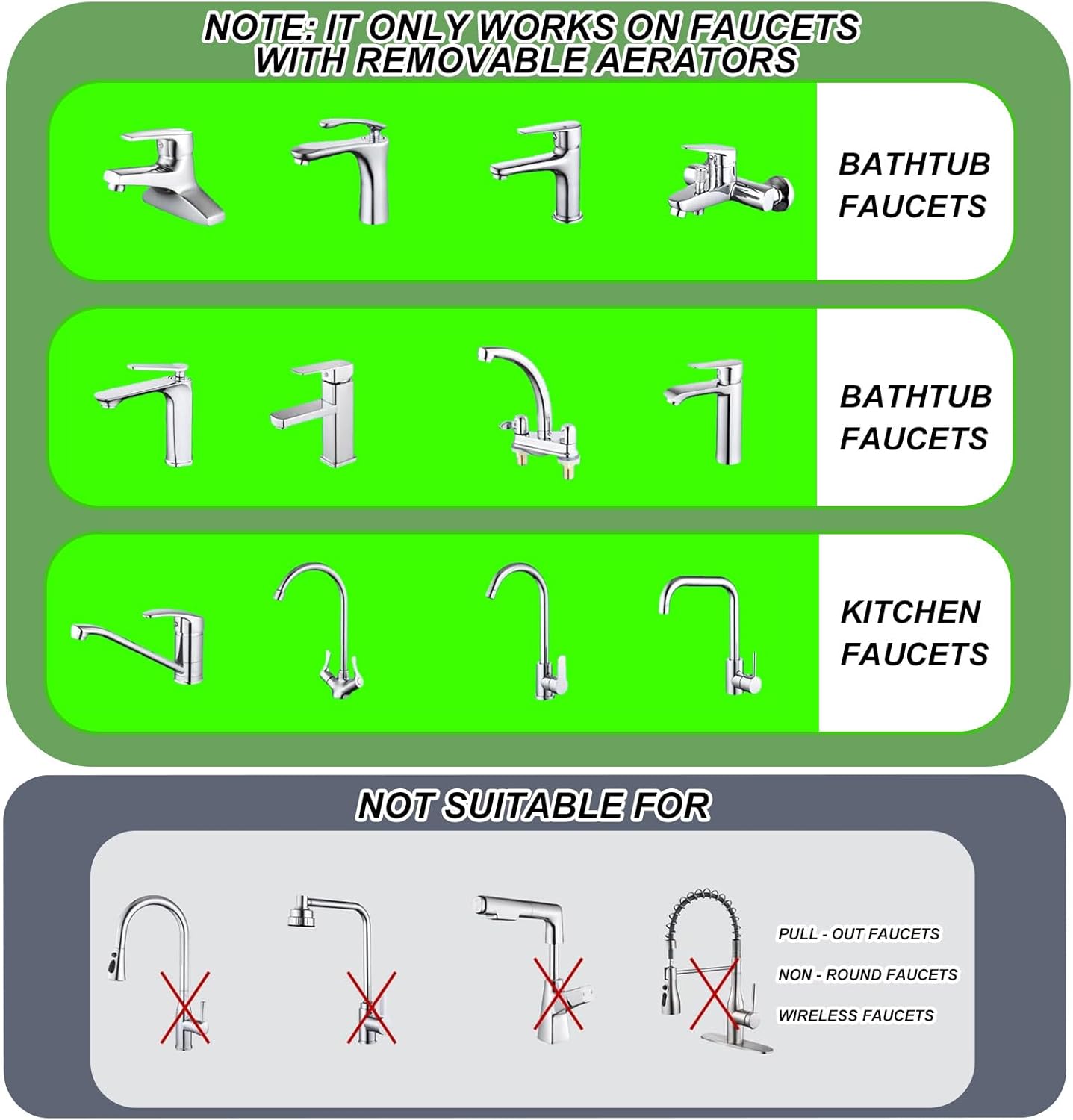 • Wide Application: Suitable for faucets with removable aerators, such as kitchen faucets, bathtub faucets, bathtub faucets. Not suitable for pull-out faucets, non-round faucets and wireless faucets.