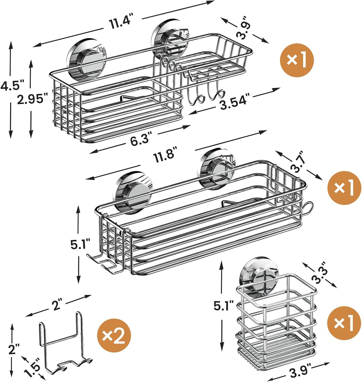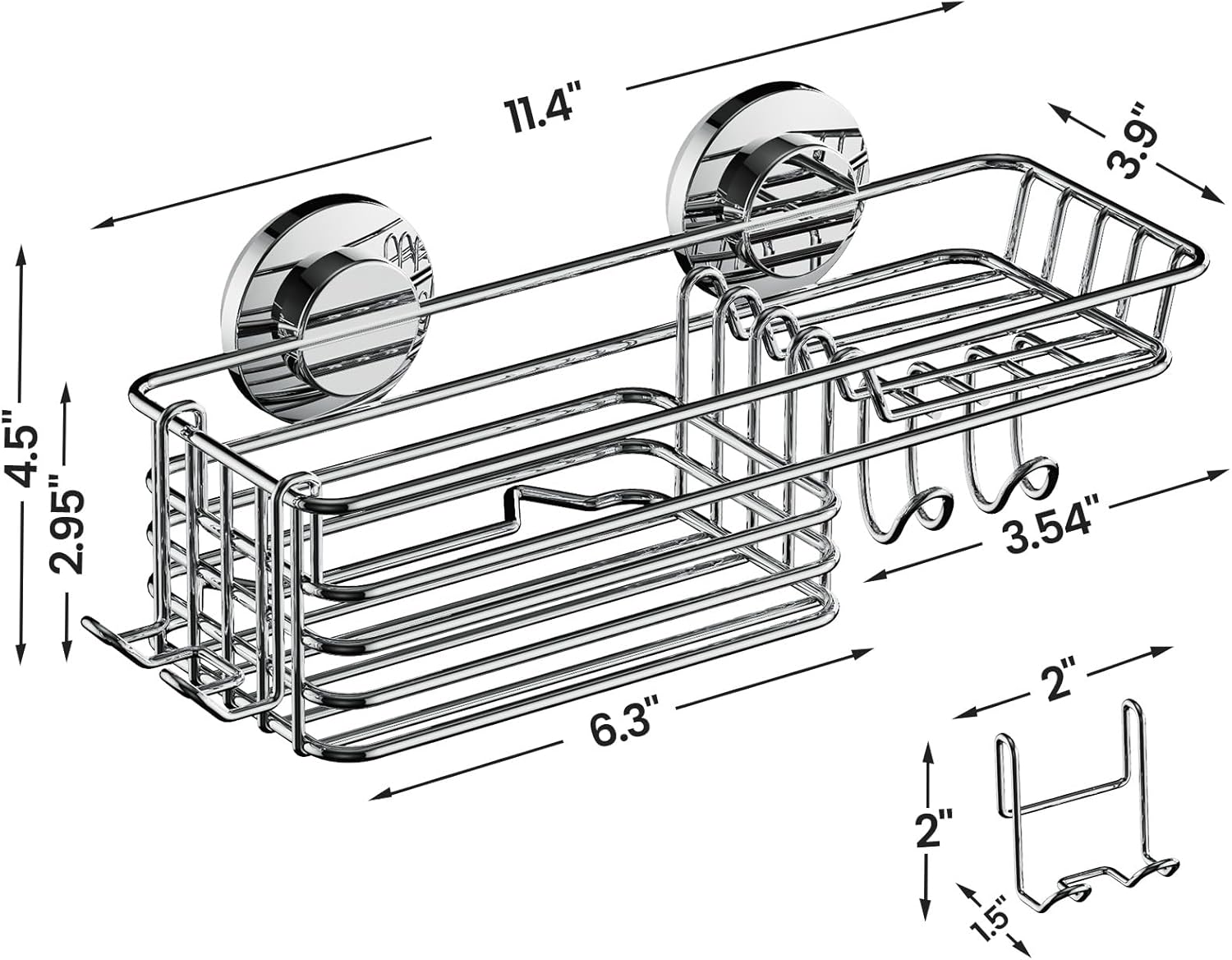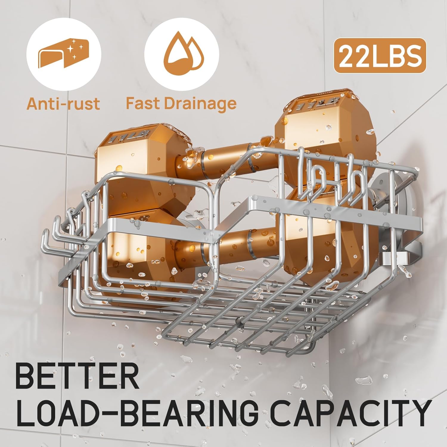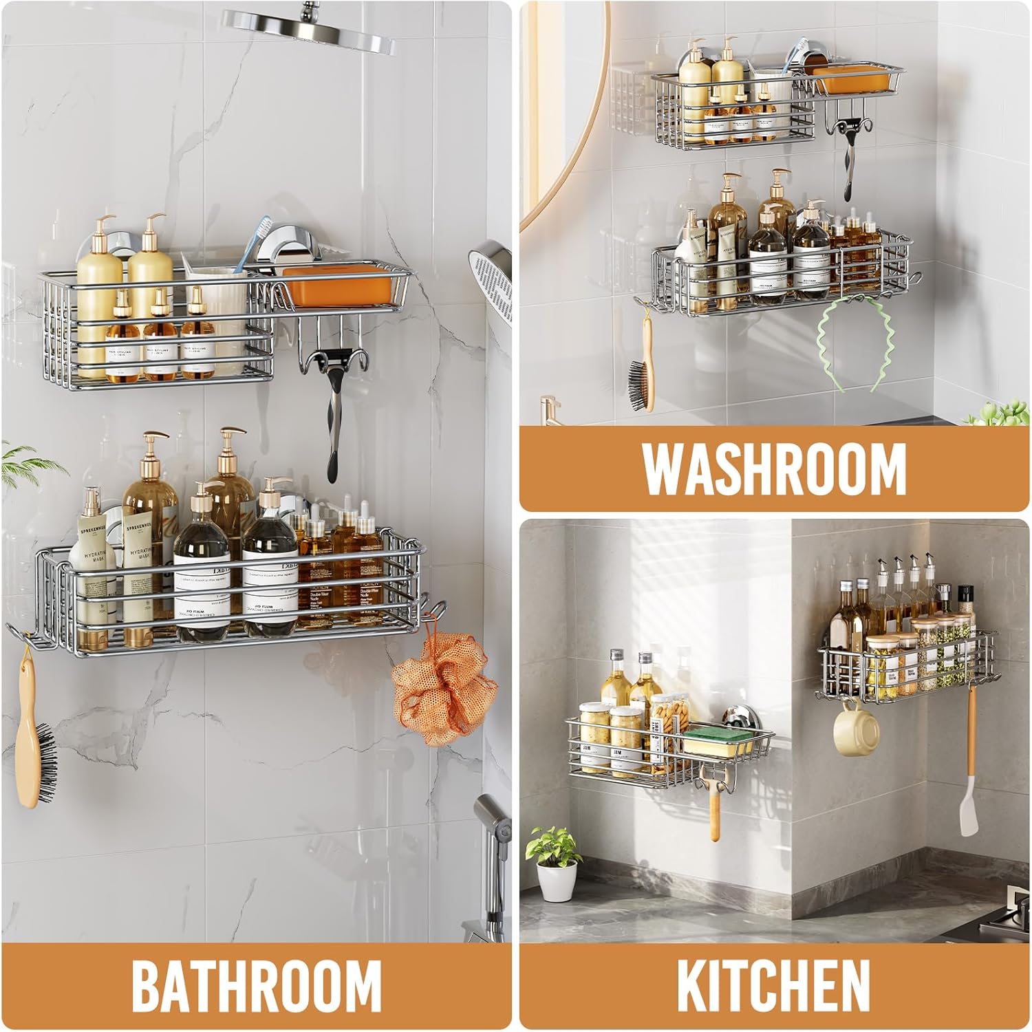• Humanized Hooks and Soap Holder: Large capacity for shampoo, shower gel, cosmetics, hair conditioner, hand washing liquid and soap. Also shower basket includes 2 large size hooks, you can hand your razors, towels, brushes on it. The shower holder organizer works great in the shower/ bathroom/ bathtub/ kitchen/RV and more, meet all your storage requirement
