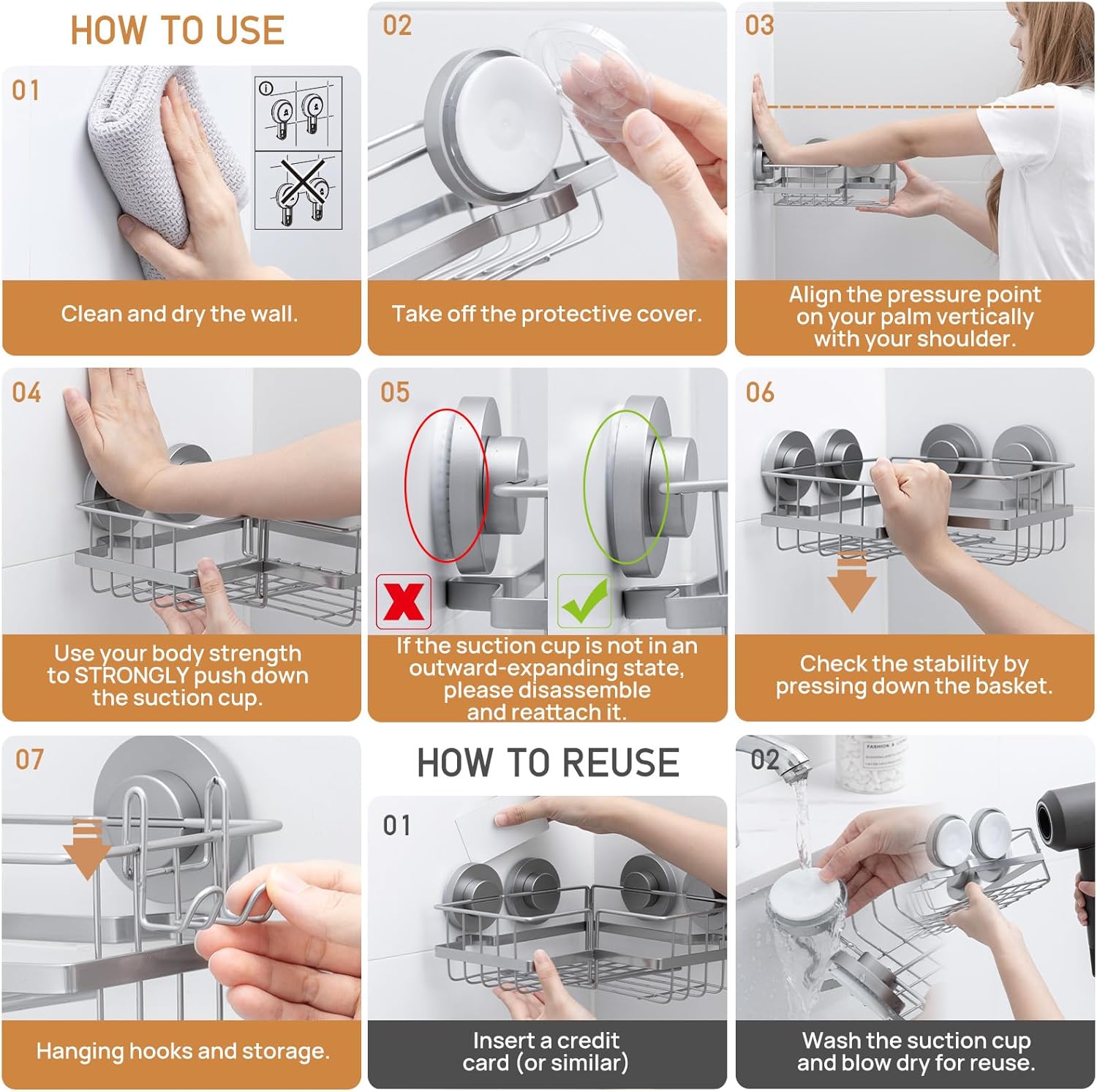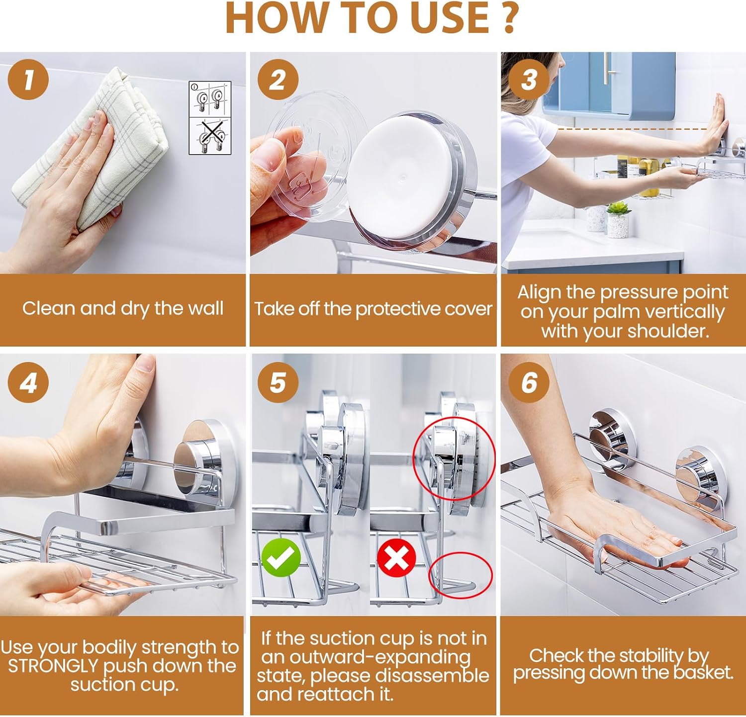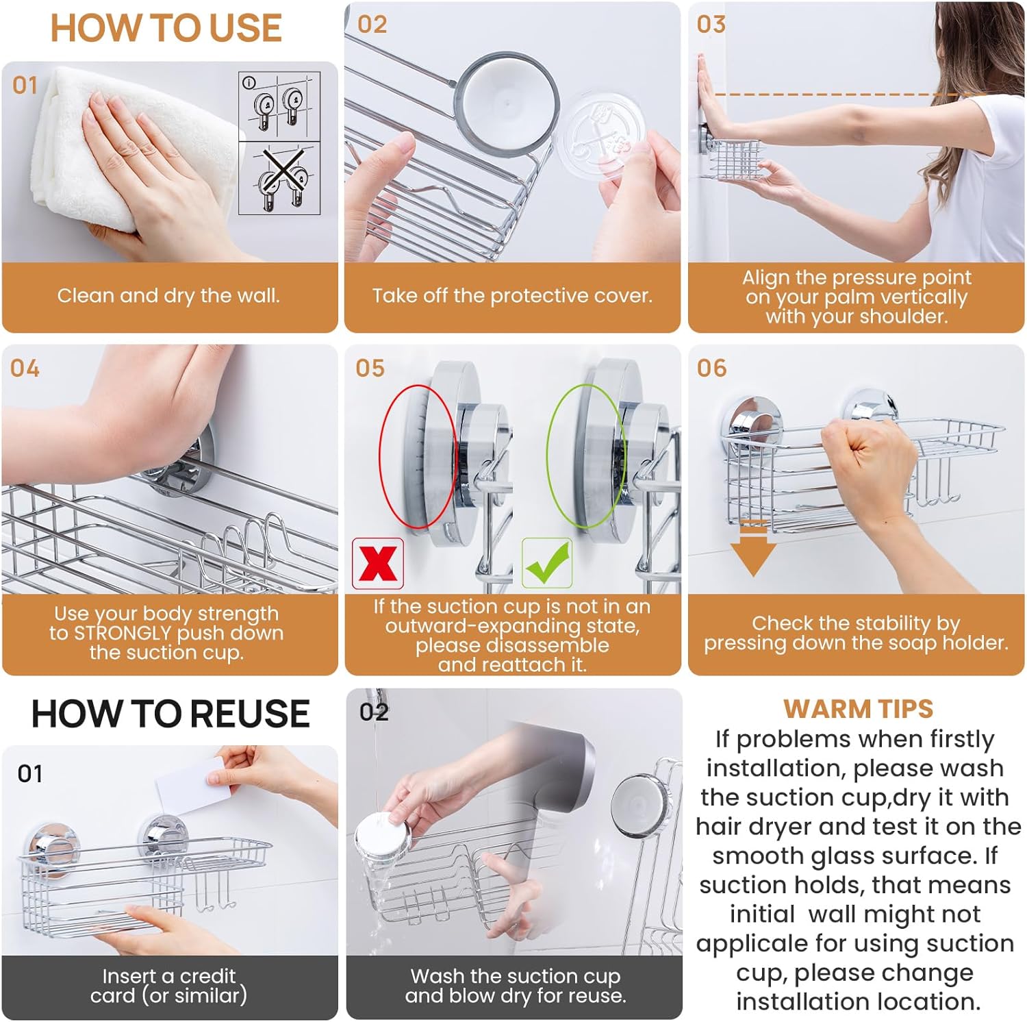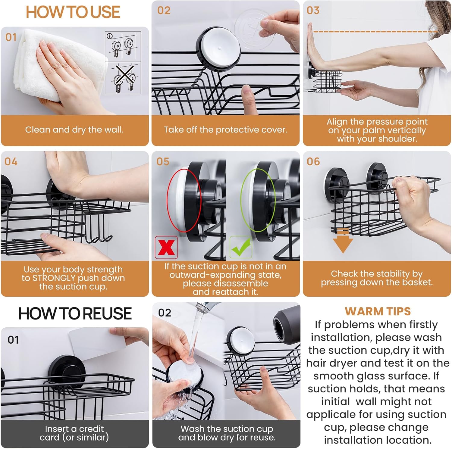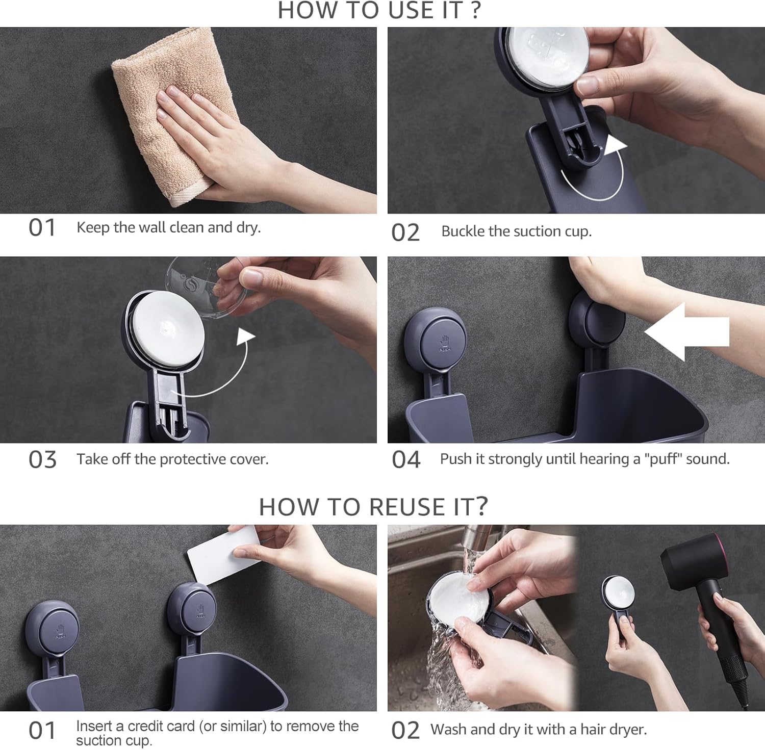 • One Second Installation & Remove: No drilling, No glue, No tools and No need to wait to apply the shower caddy. Simply choose a smooth and dry surface without any grout, take off the protective cover and push the board "PUSH" hard until you hear "PUFF", ONE second to complete the installation. The suction cup is removable without leaving any marks, so you can adjust height and position whenever you want