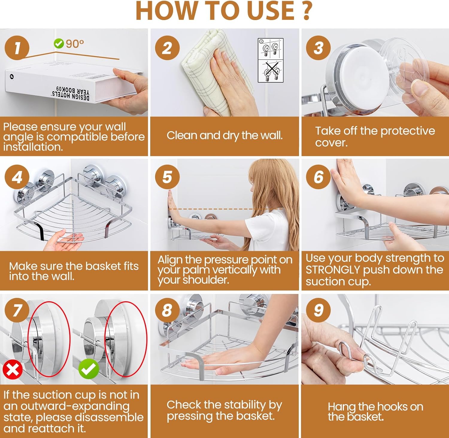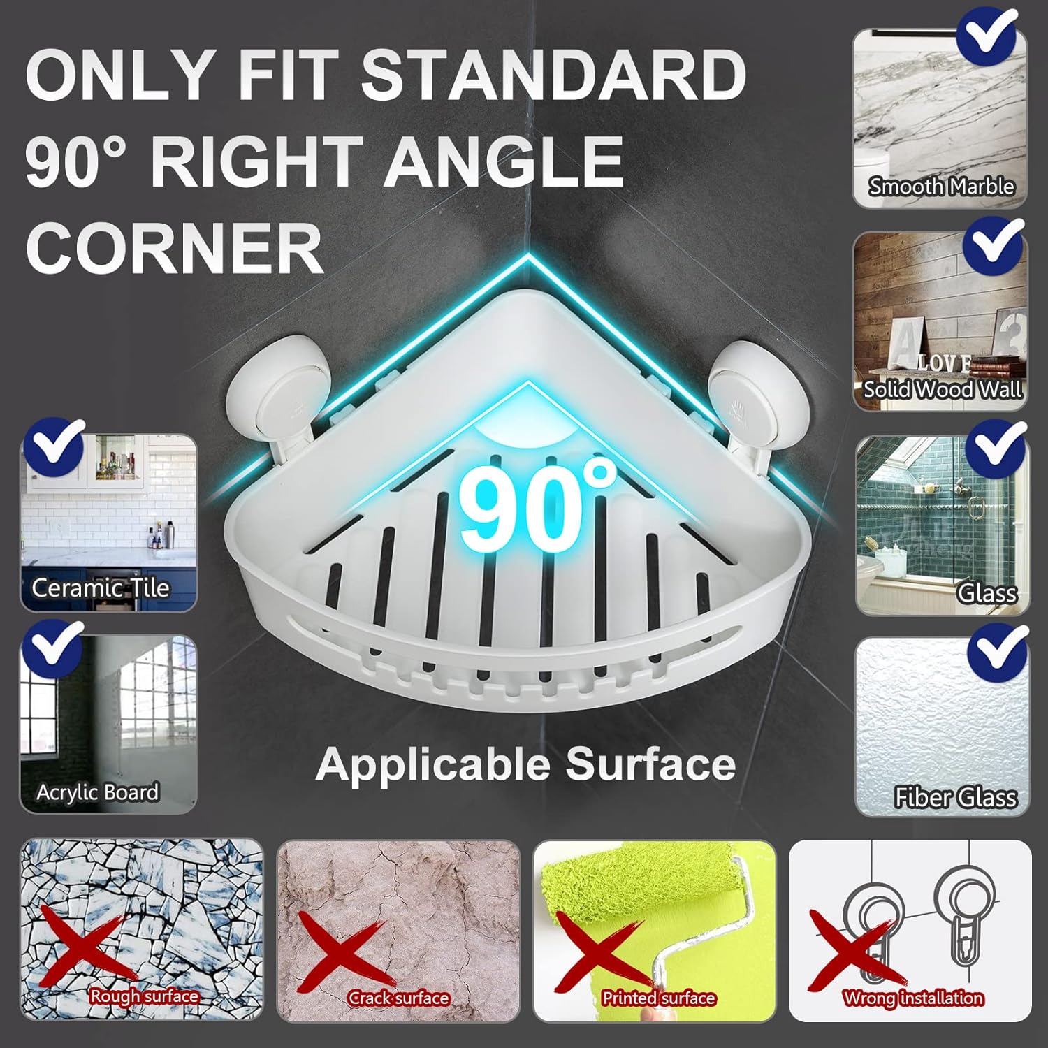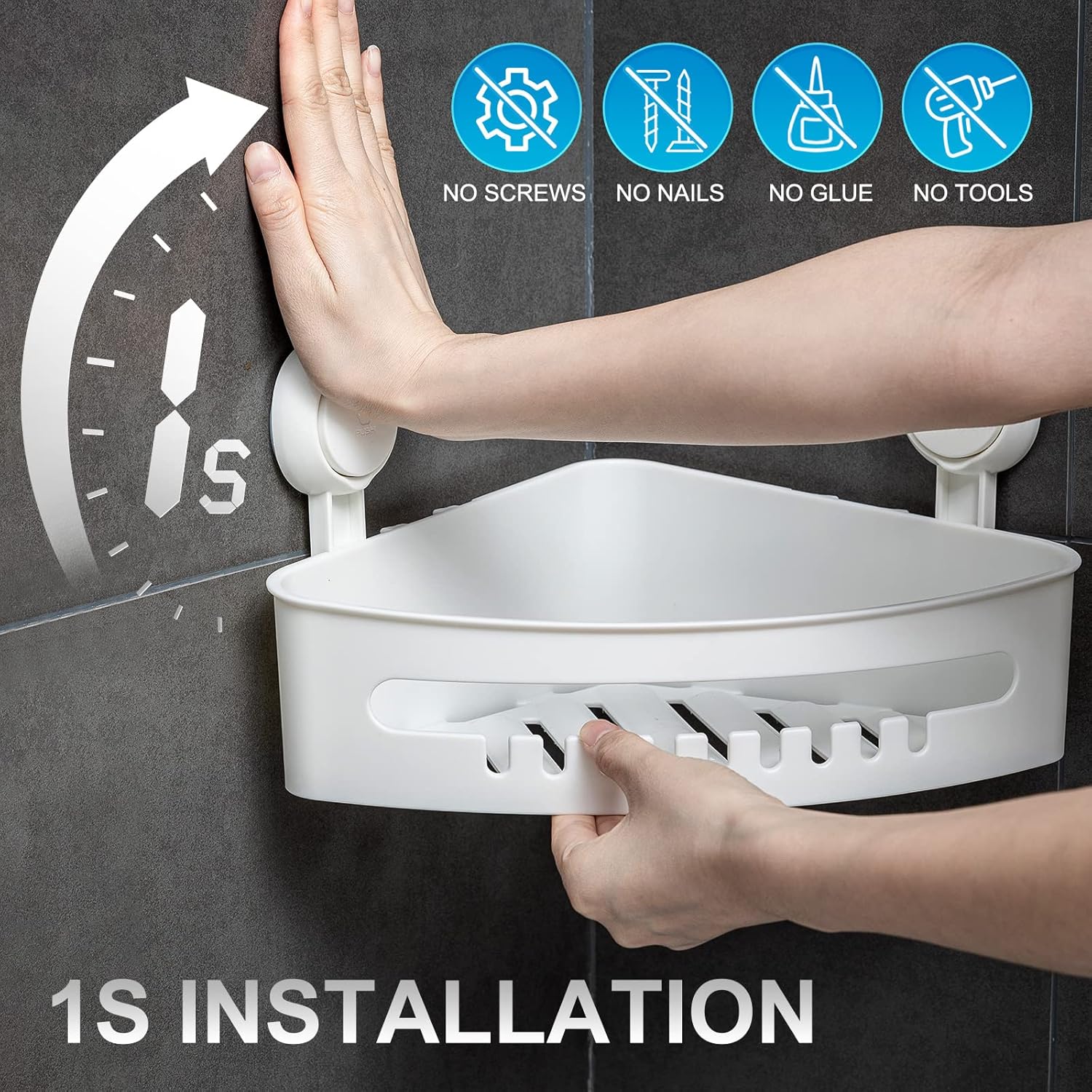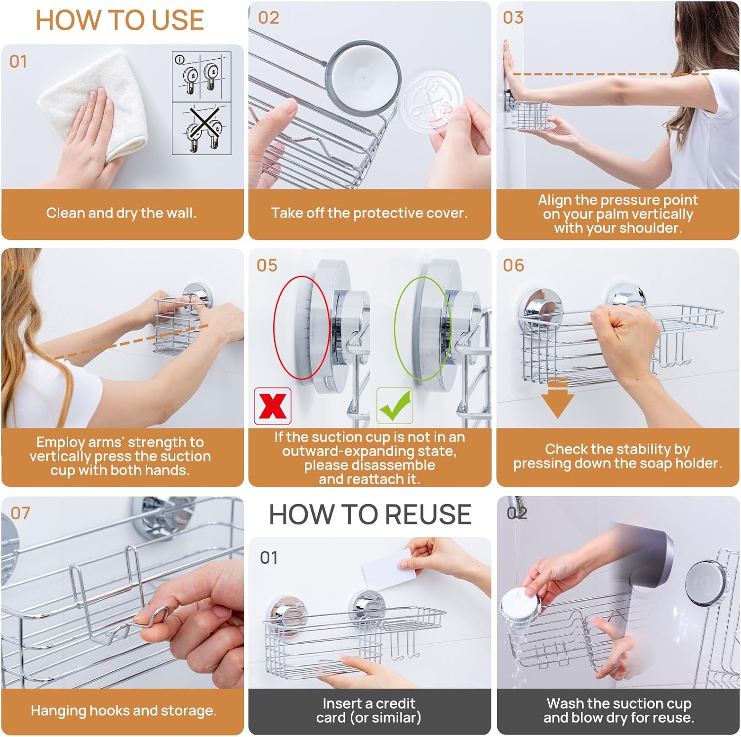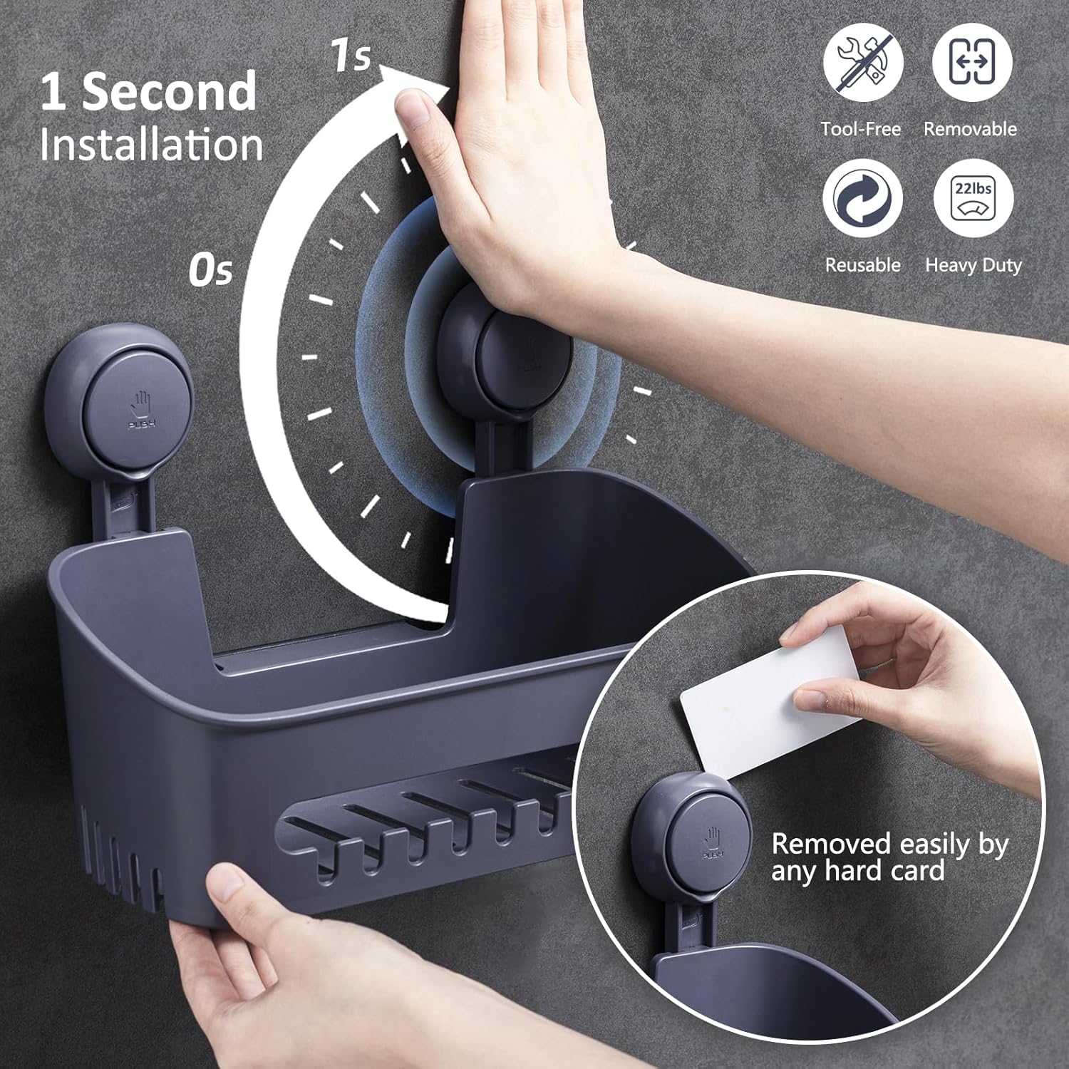 • One Second Installation & Remove: No drilling, No glue, No tools and No need to wait to apply the shower caddy. Simply choose a smooth and dry surface without any grout, take off the protective cover and push the board "PUSH" hard until you hear "PUFF", ONE second to complete the installation. The suction cup is removable without leaving any marks, so you can adjust height and position whenever you want