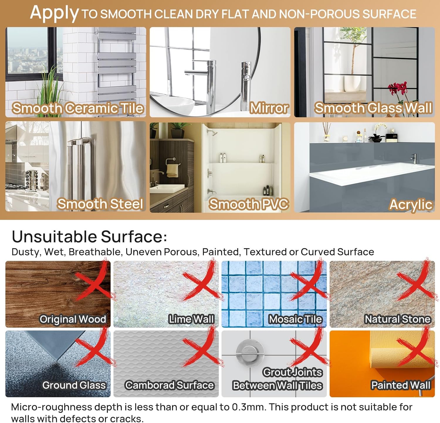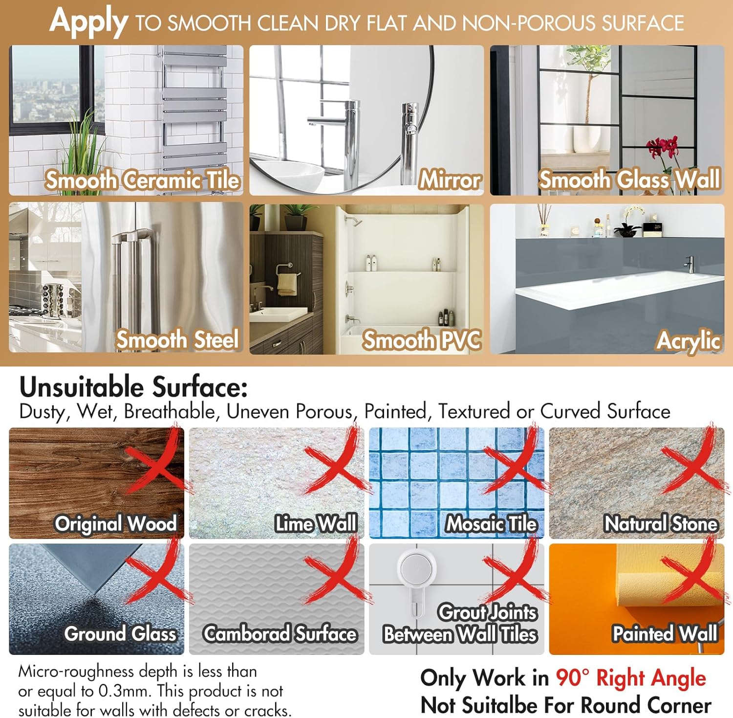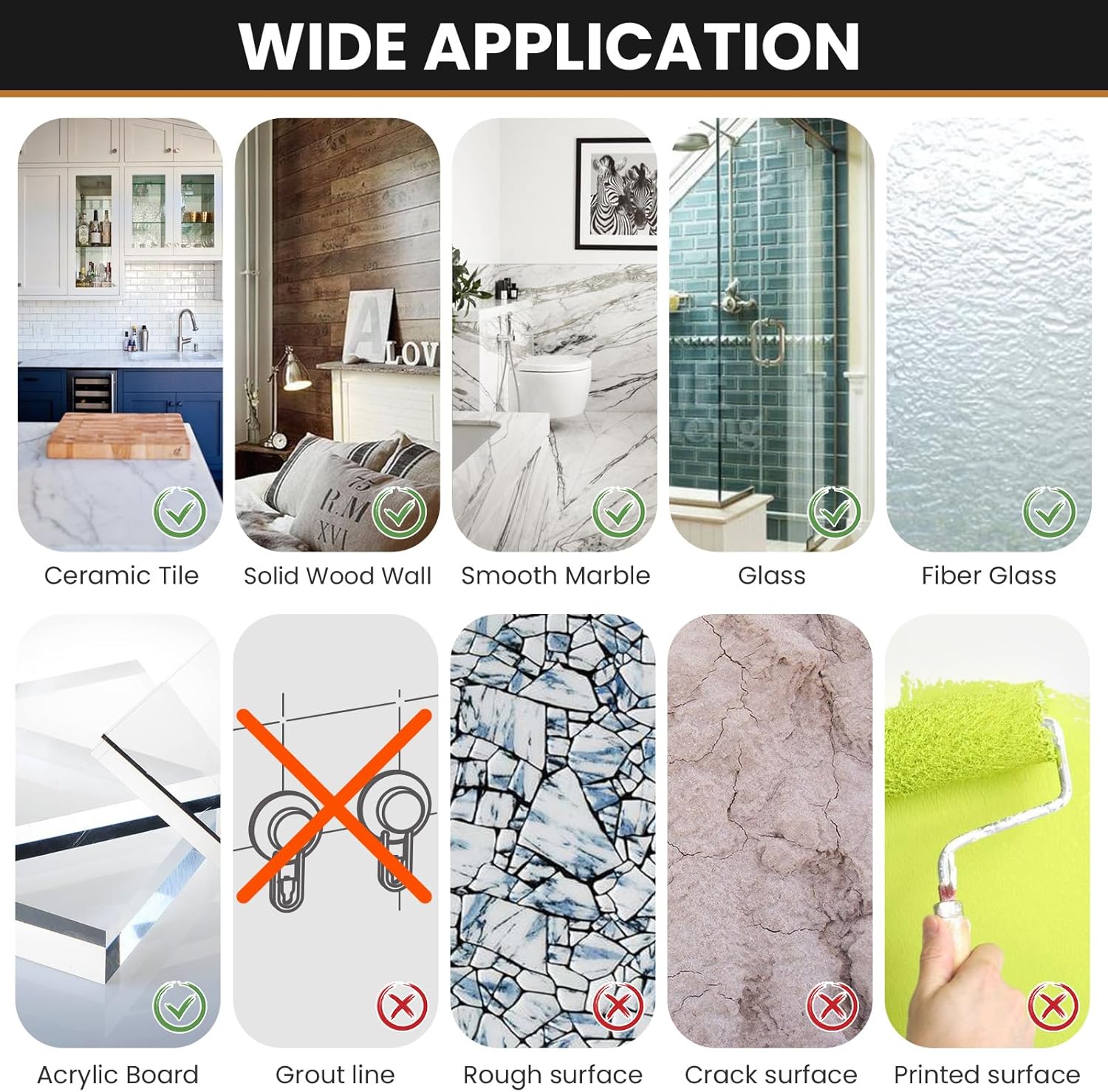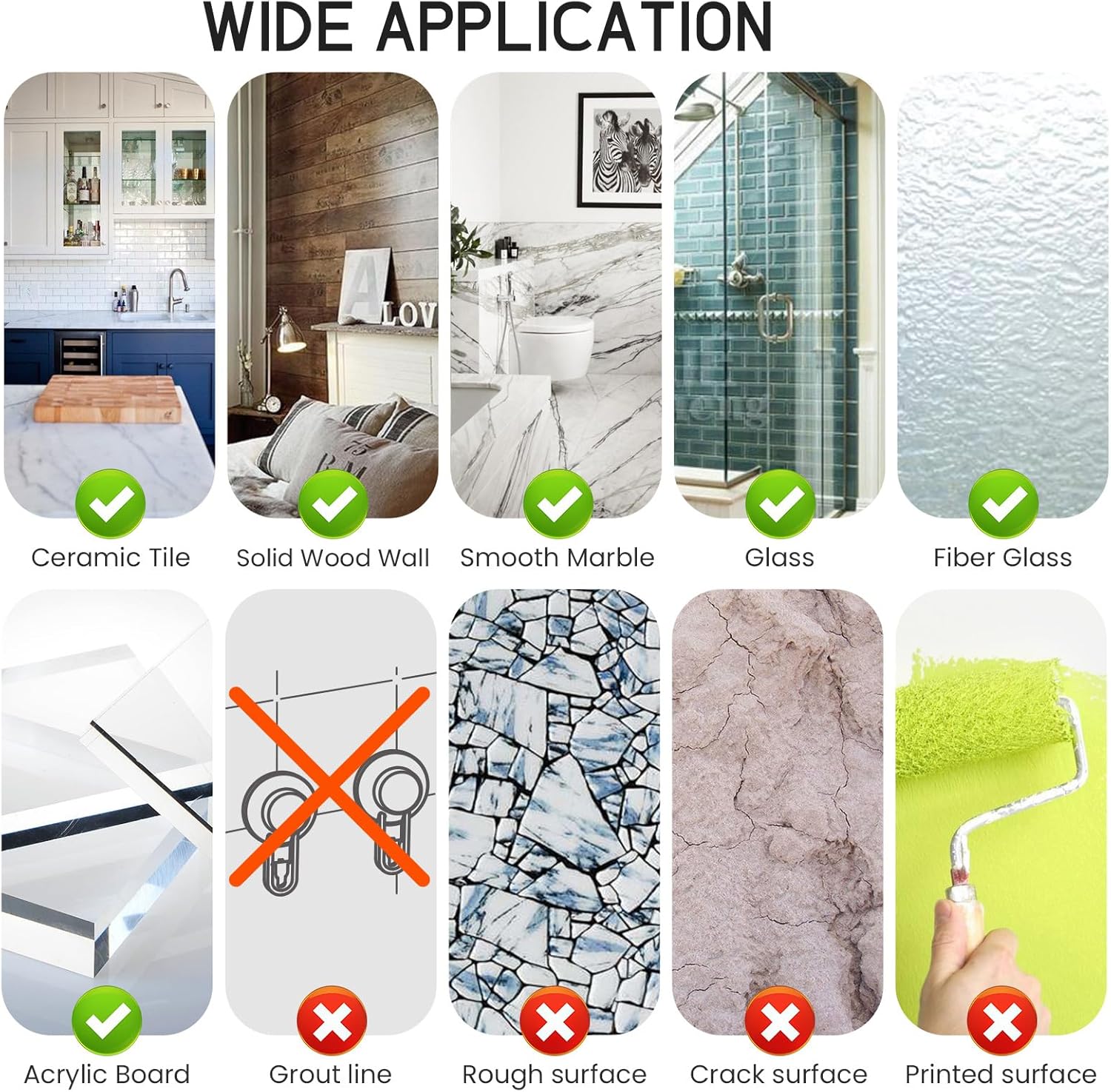 • Warn Tips: ONLY work for ceramic tile (uncracked), glass, mirror, polished metal, stainless steel and acrylic. Please don't stick to a grout line. NOT work for painted/dry wall, wood, wall paper or any other rough/crack wall. If problems when firstly installation, please wash the suction cup, dry it with hair dryer and test it on the smooth glass surface. If suction holds, that means initial wall might not applicable for using suction cup, please change installation location